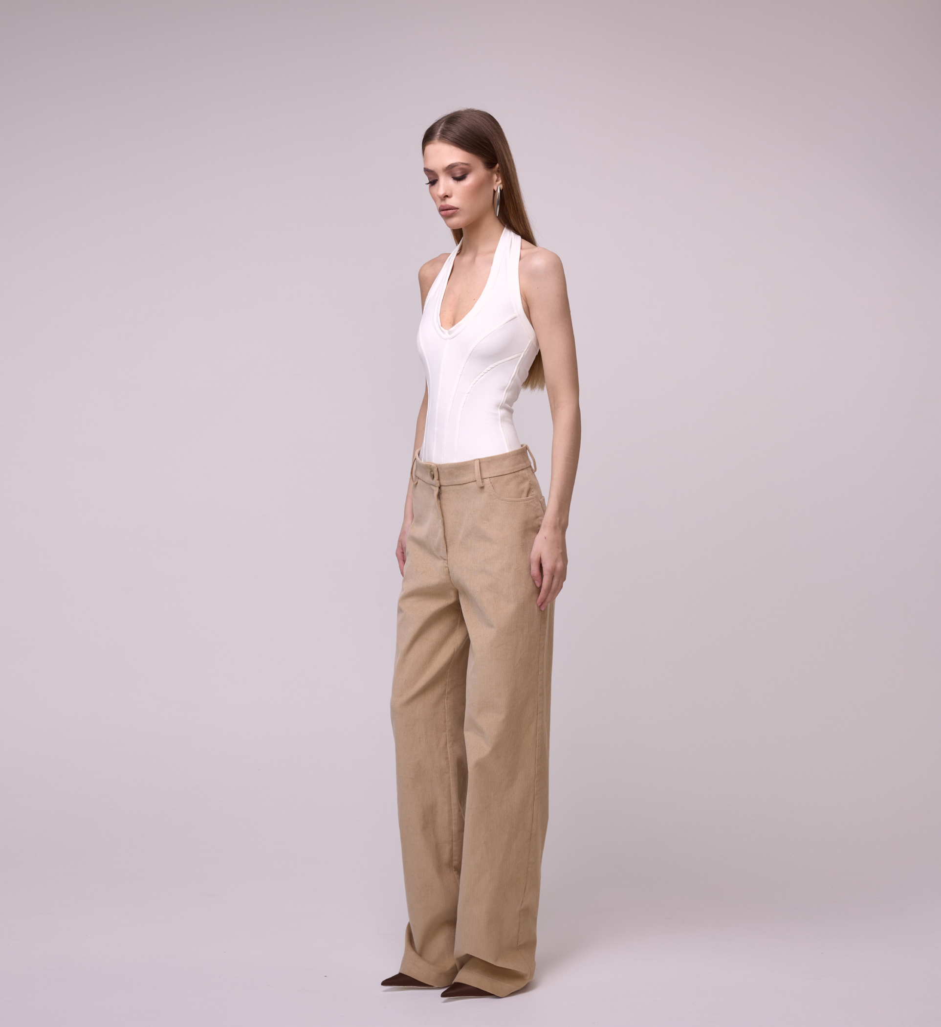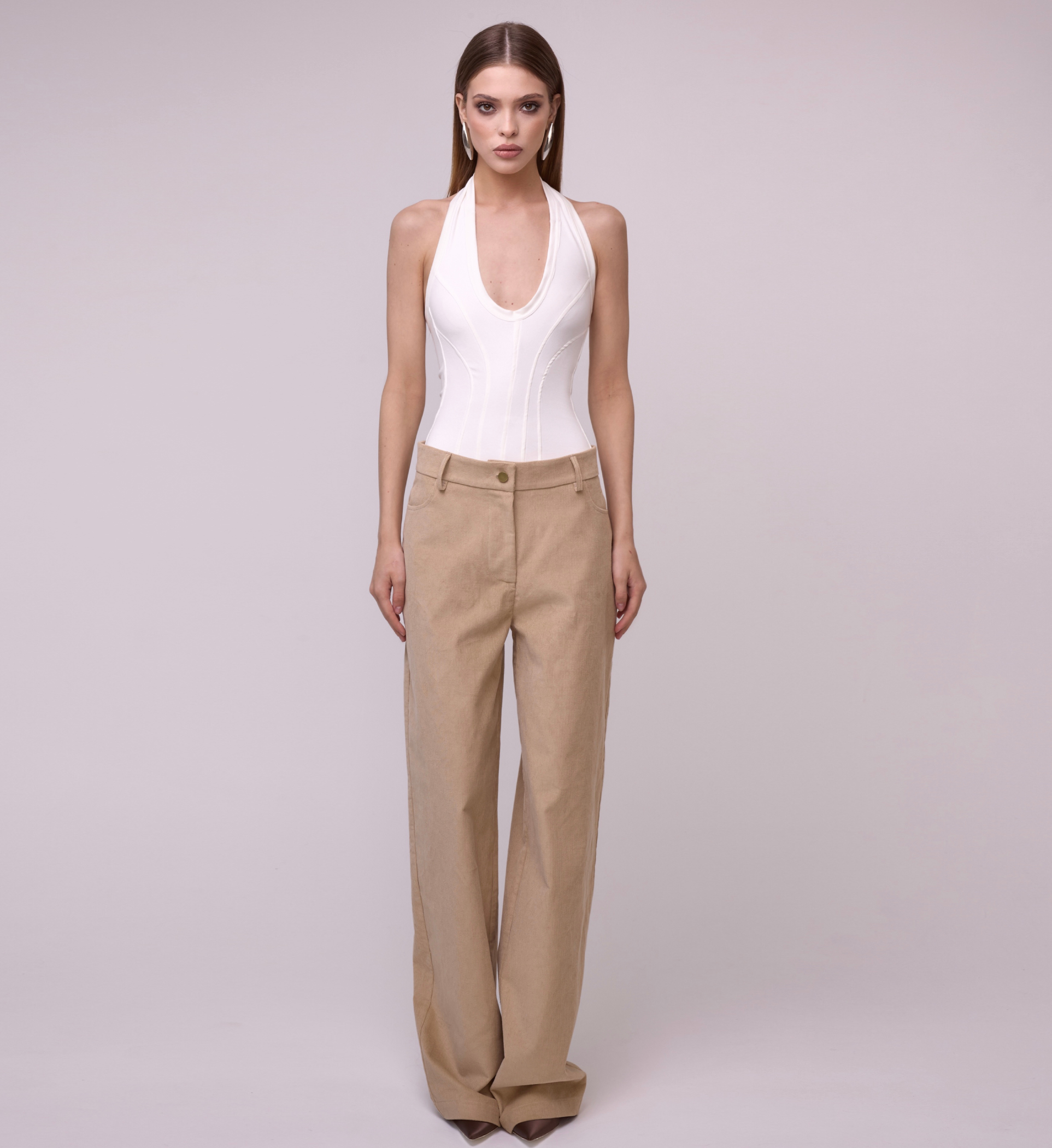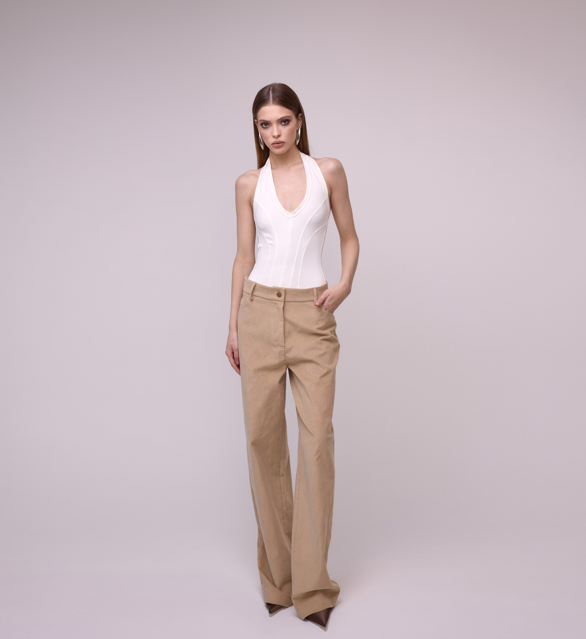 The cotton bodysuit with ribbed neck in the form of a corset with stretching elements in milky color.