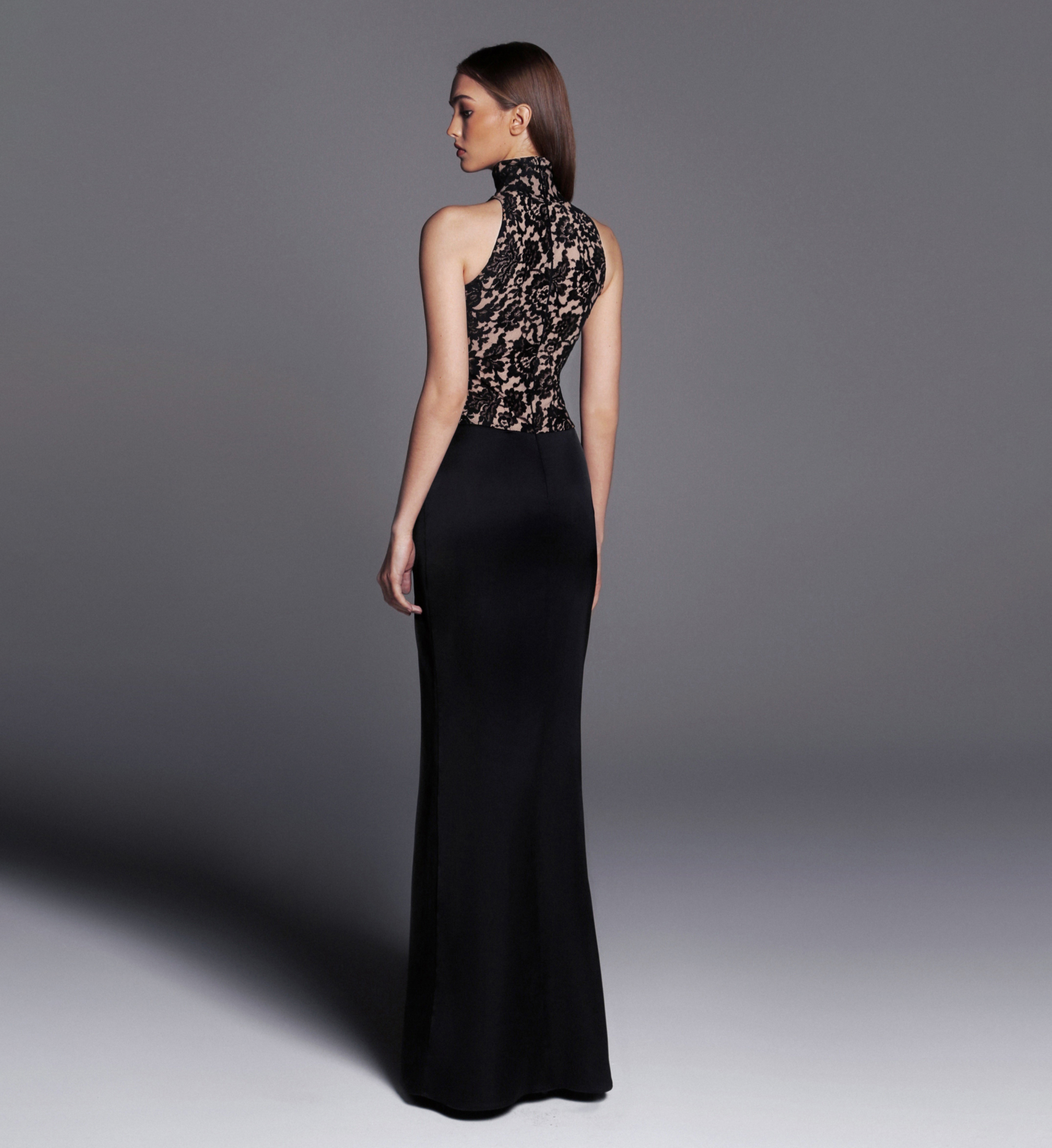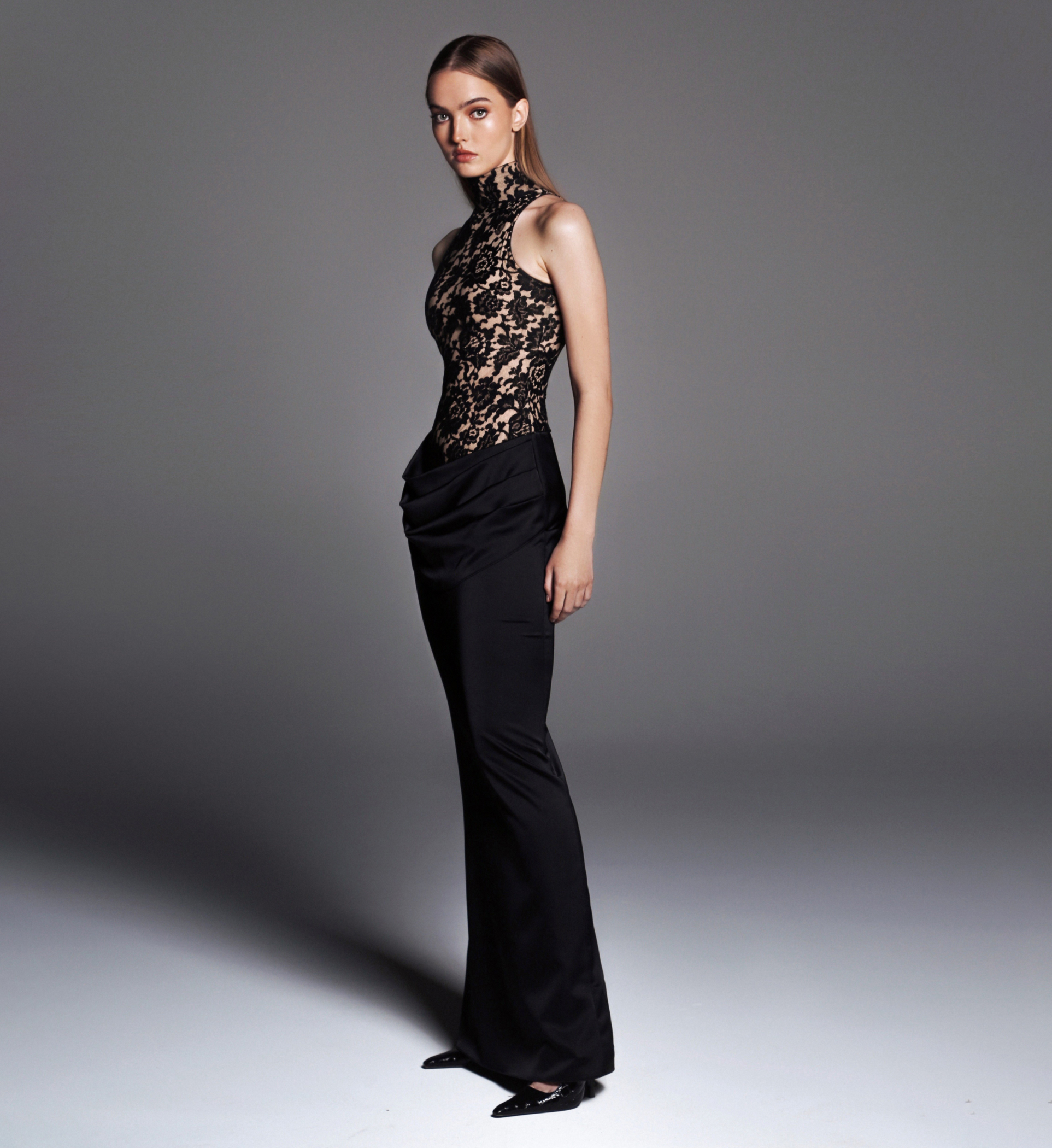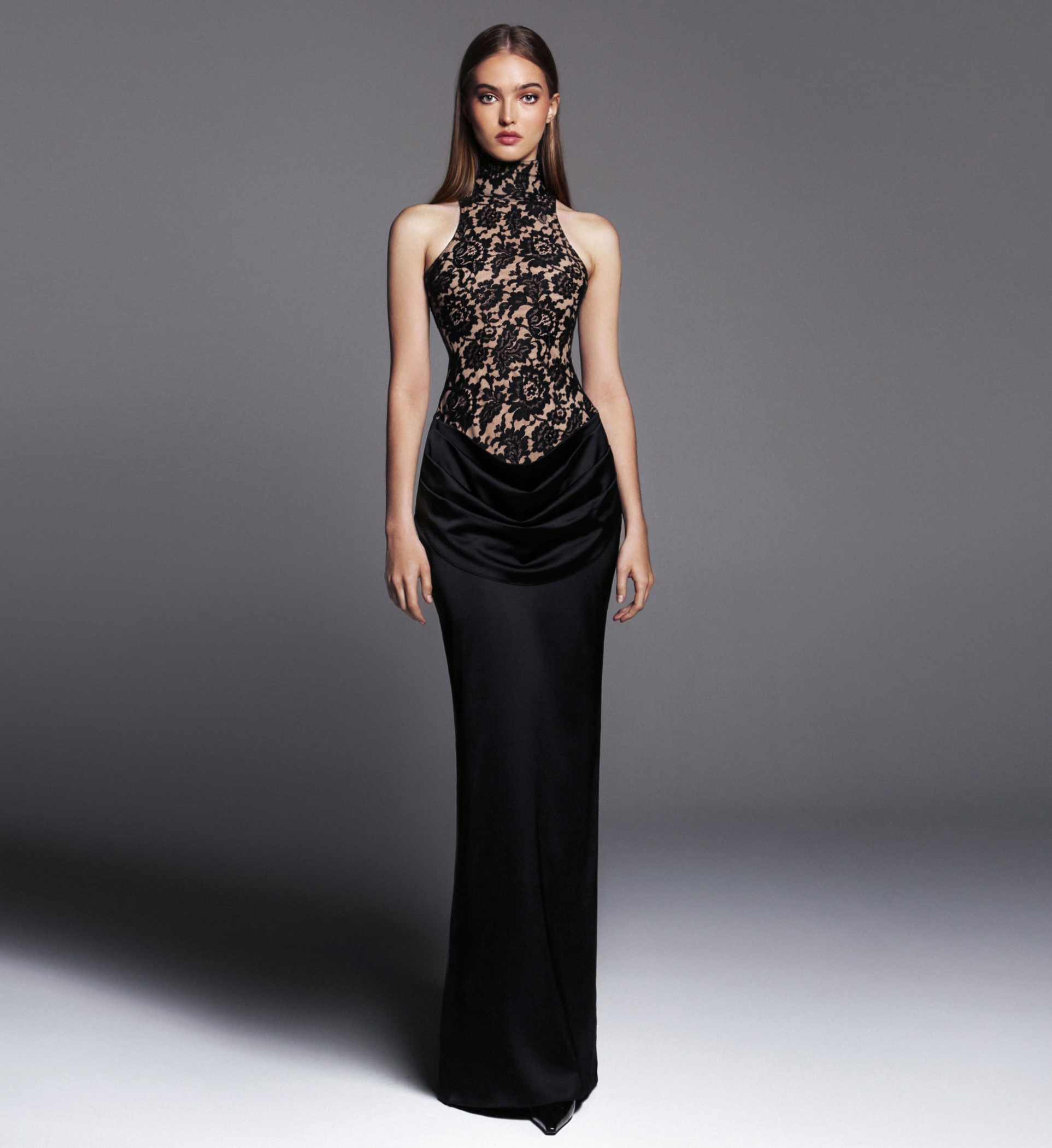 The dress BLACKEST in maxi lenght made of cotton lace with a draped skirt of black atlas.
