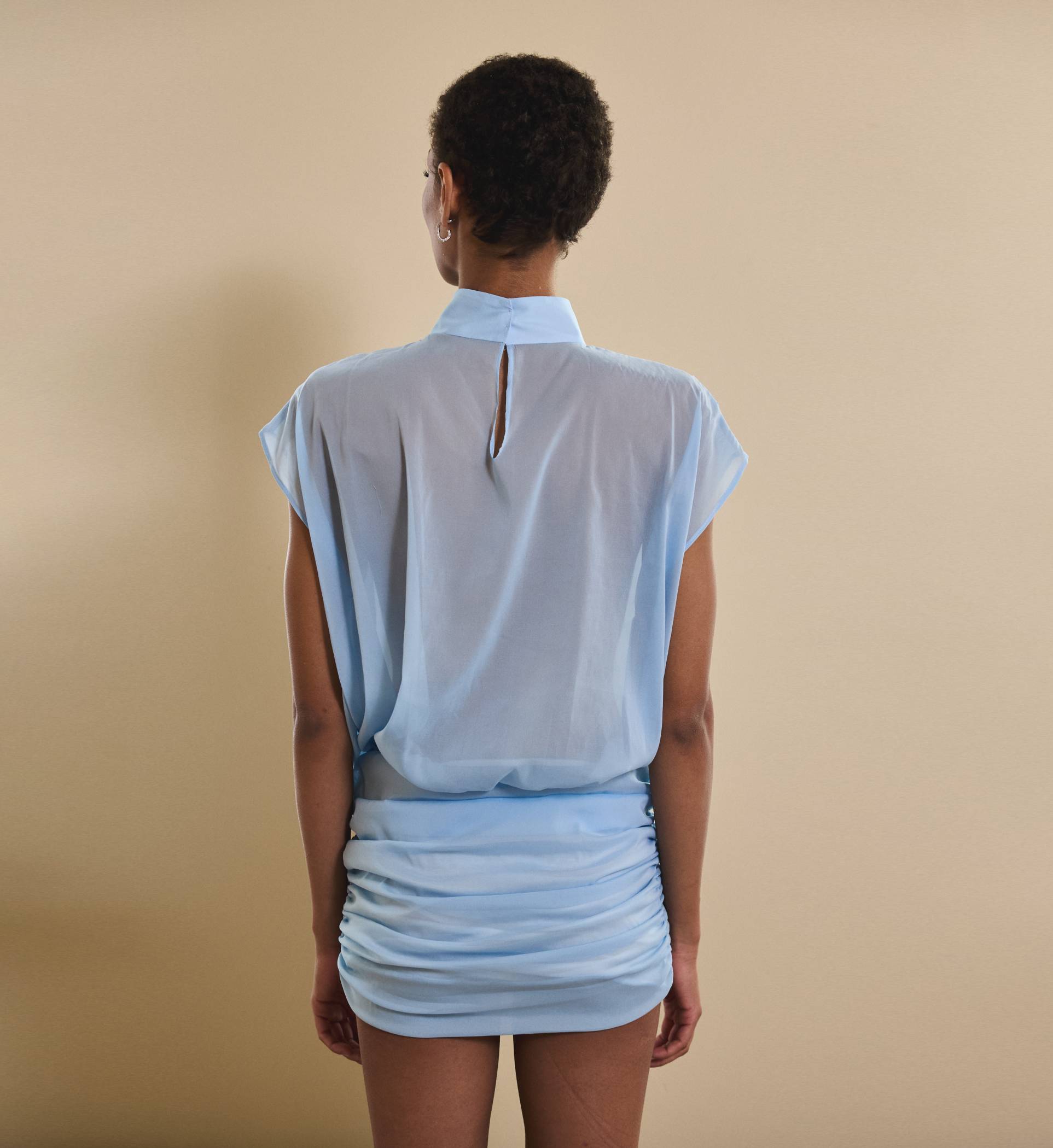 The dress made of silk elastic chiffon in pale blue color with a translucent top.