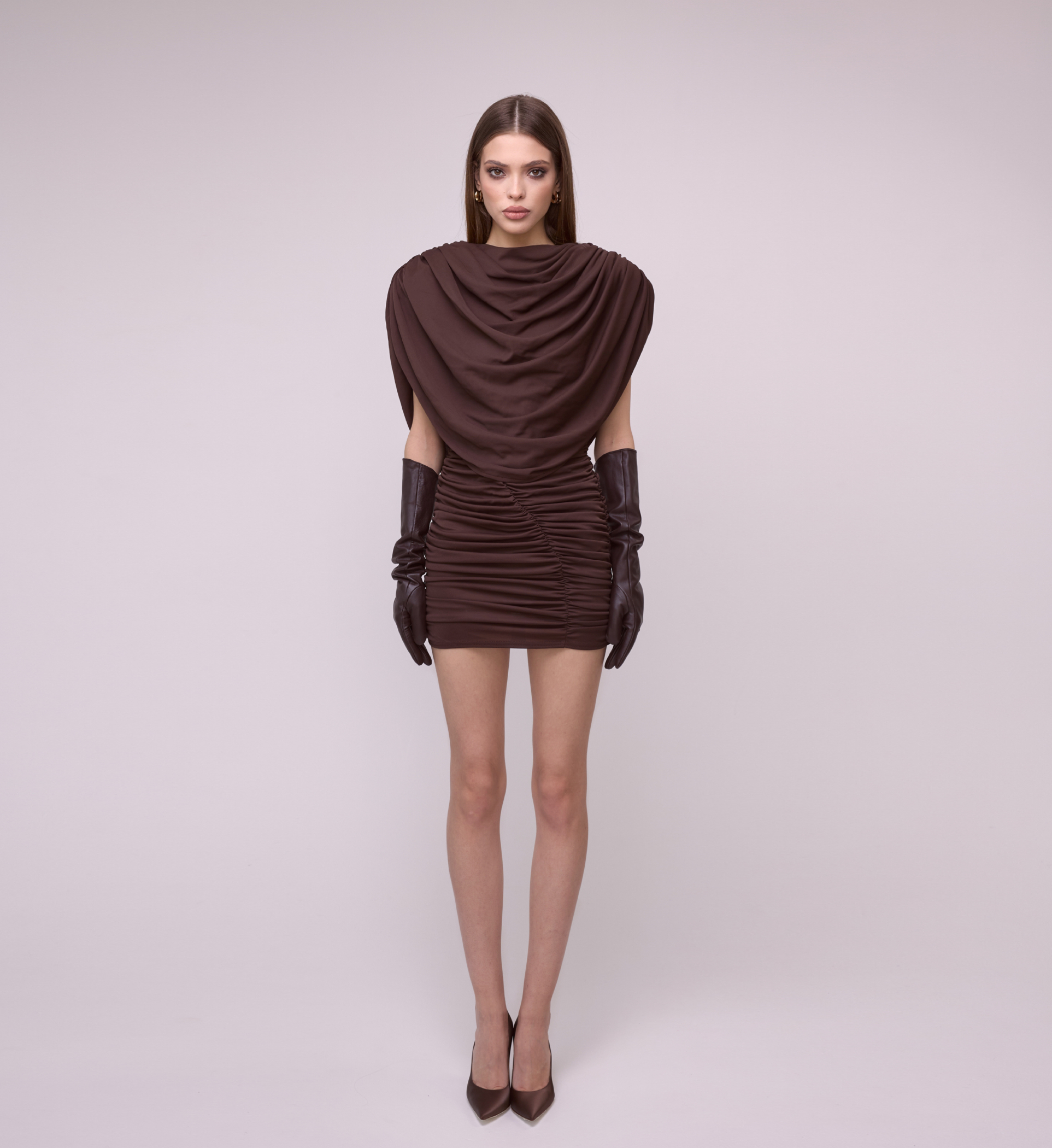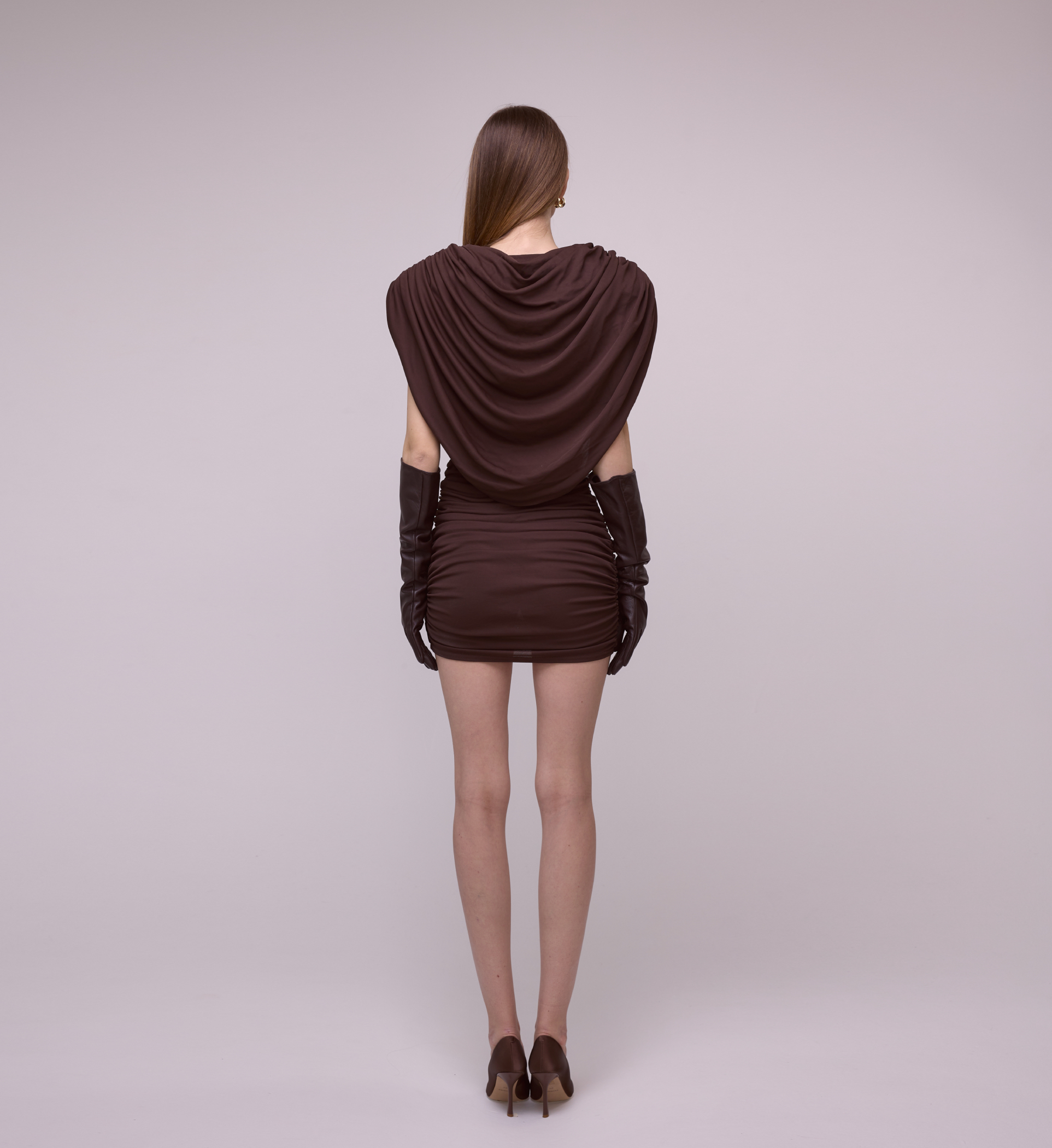 The dress with a cape and ruffles in mini-lenght made of knitted viscose in chocolate color (Gloves are not included).
