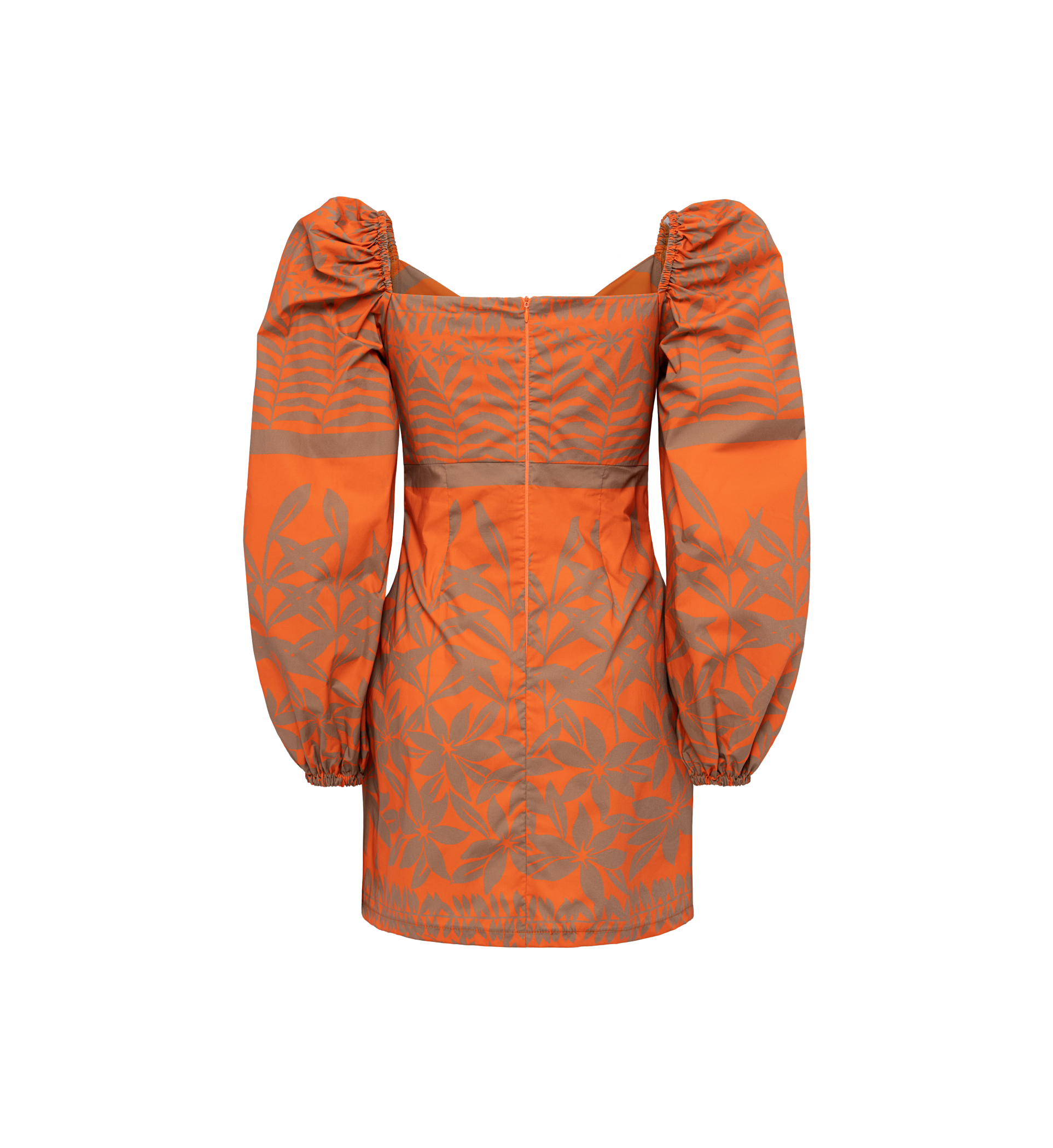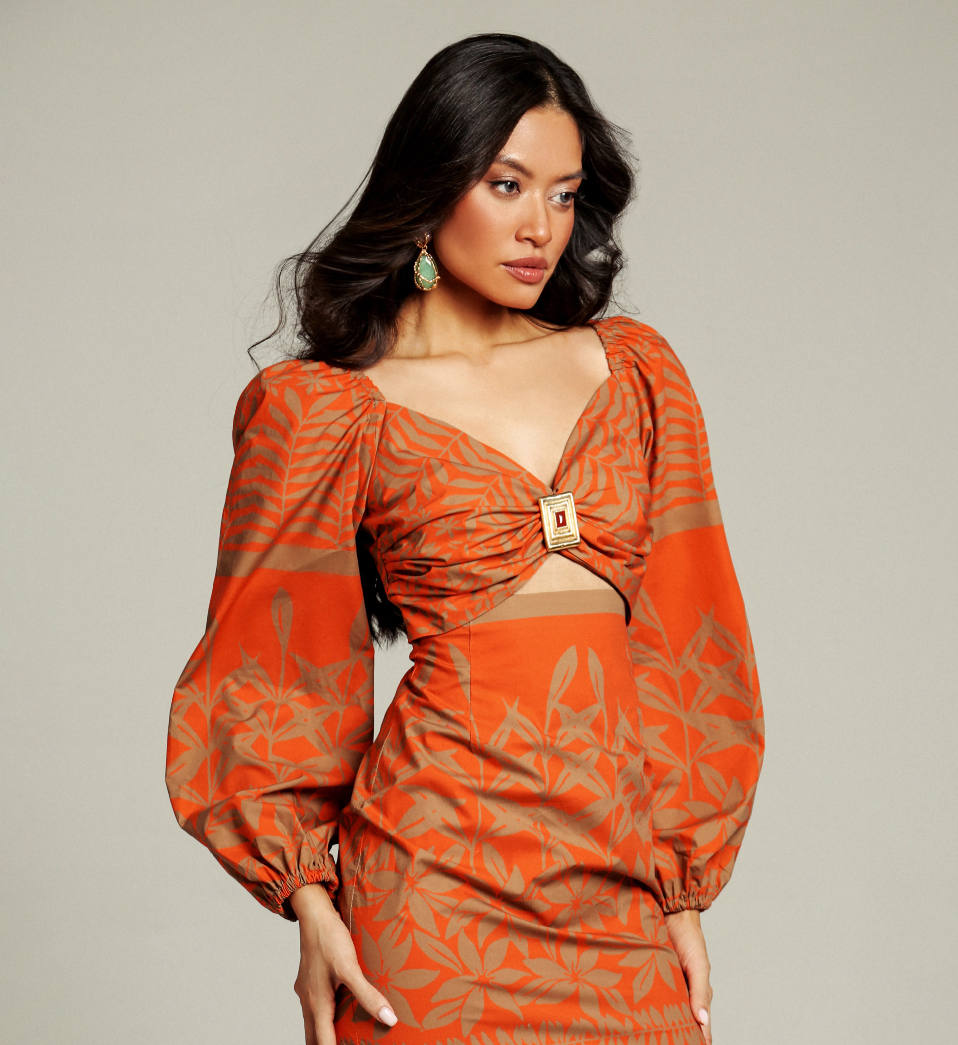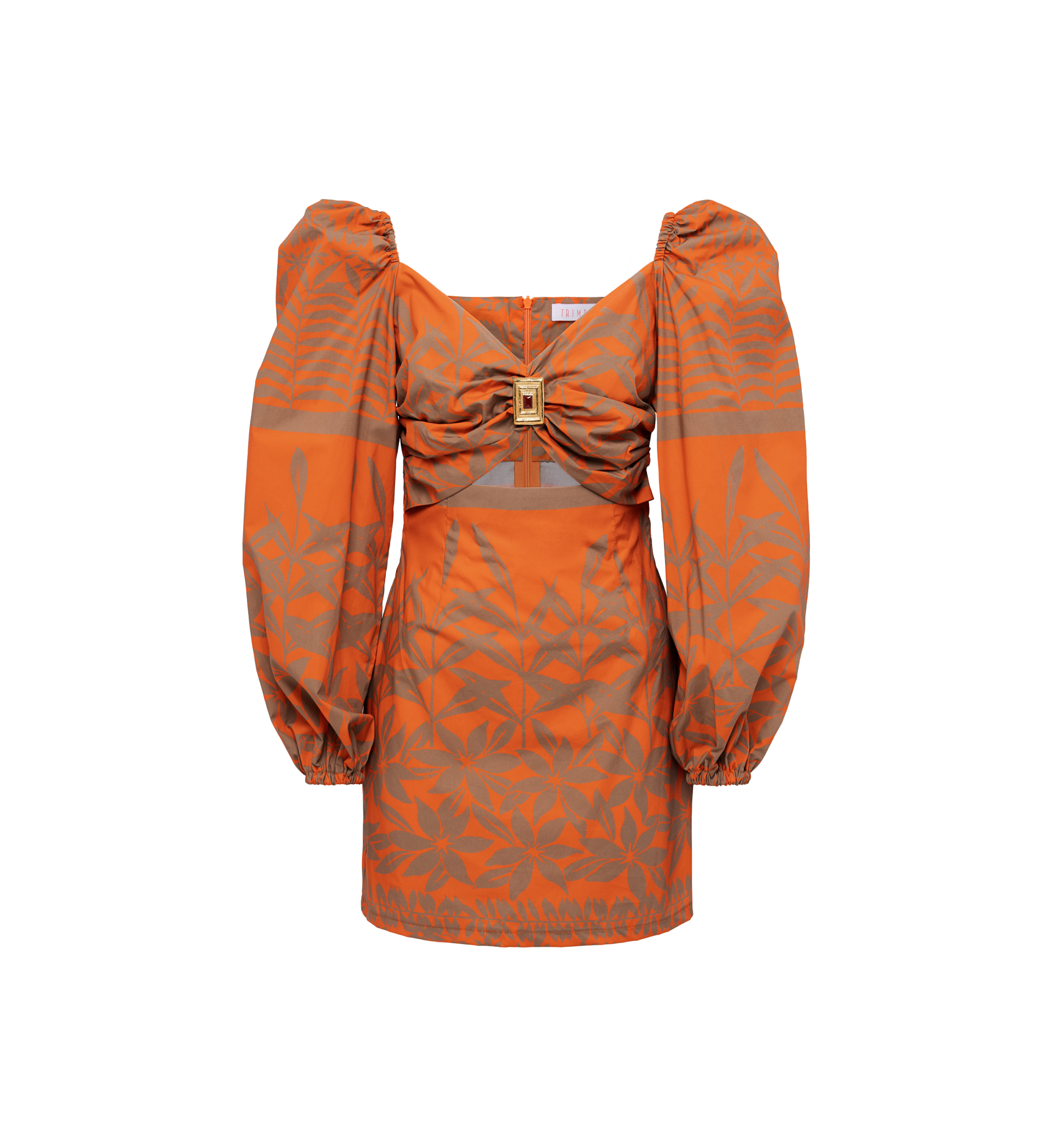 Mini terracotta dress made of cotton poplin, complemented by a silver brooch with gilding and a semi-precious carnelian stone. The fitted cut emphasizes feminine curves, and the lightweight fabric pleasantly envelops the body.