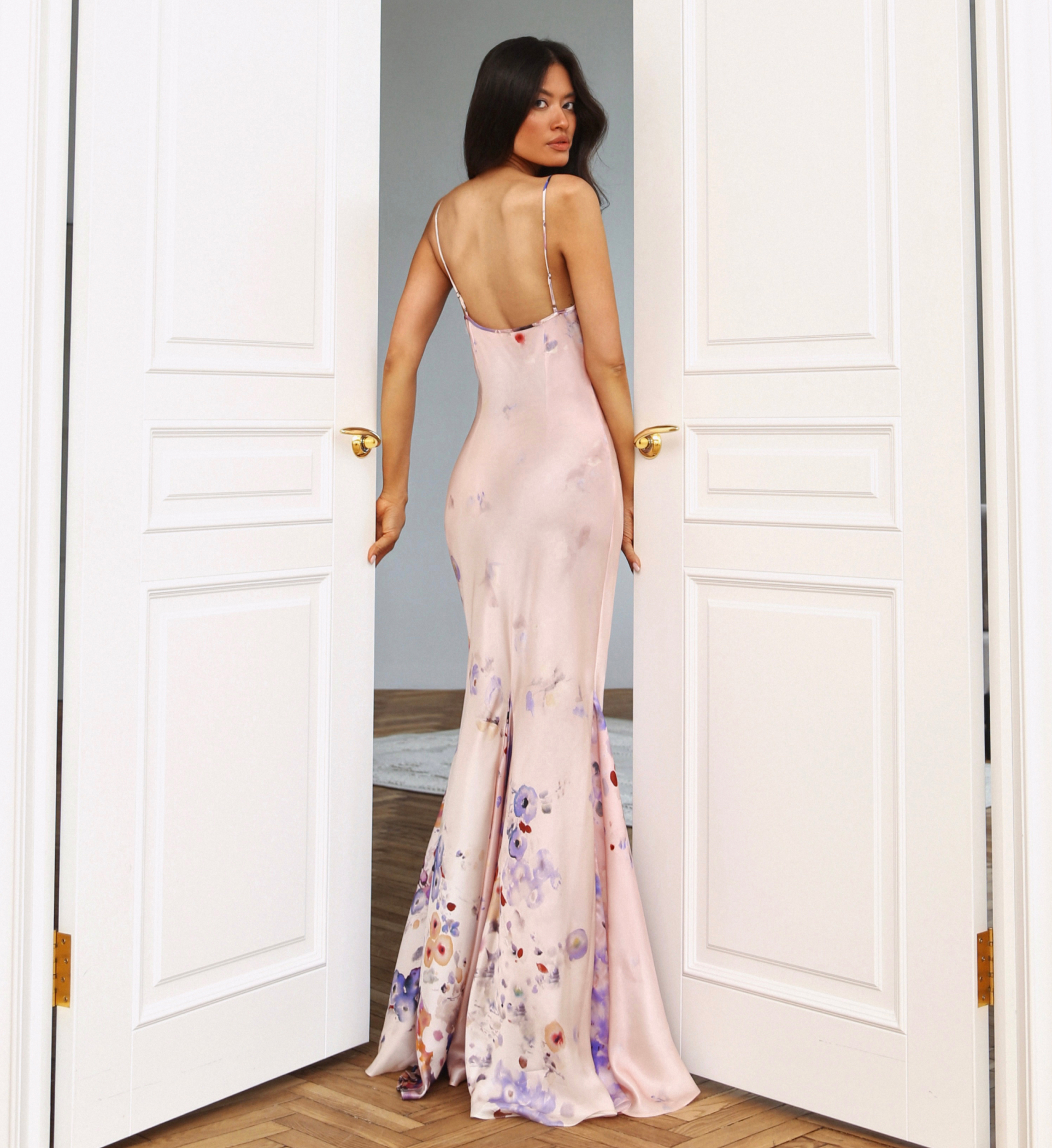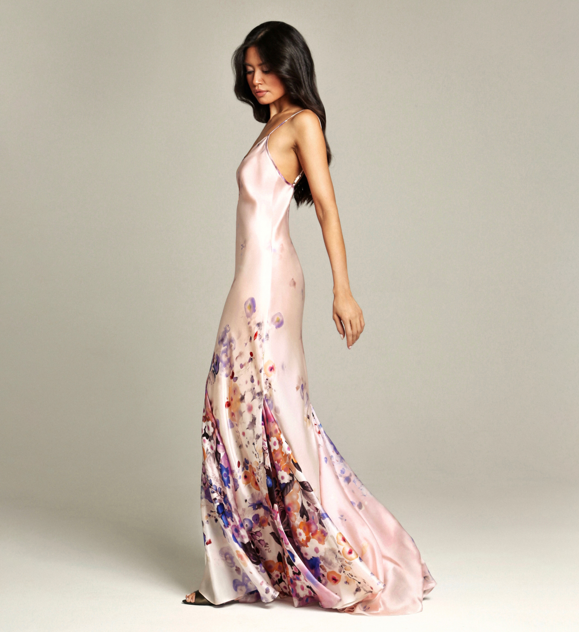 The drop neckline, maxi length and flowing silk are a guarantee of your perfection.