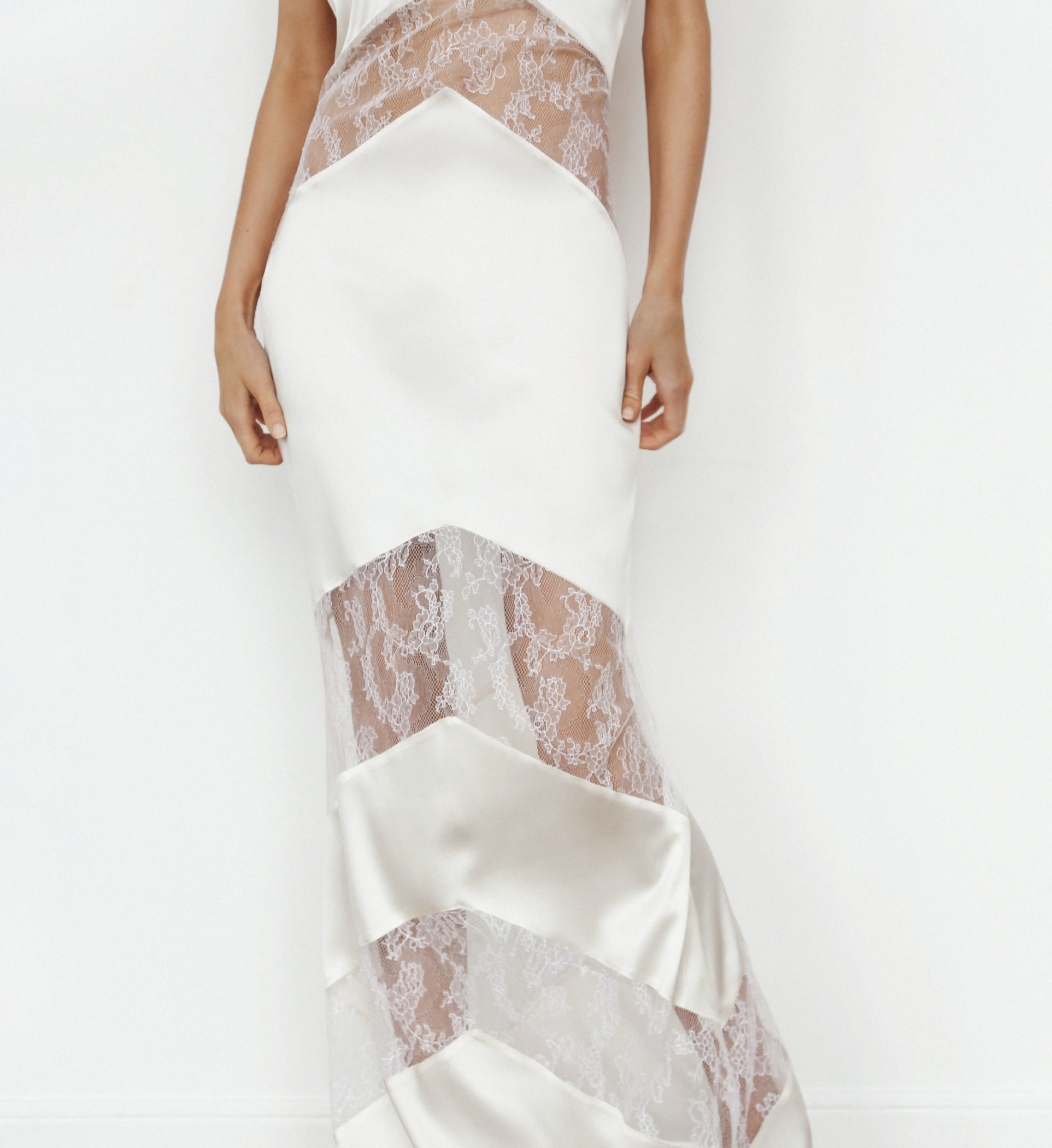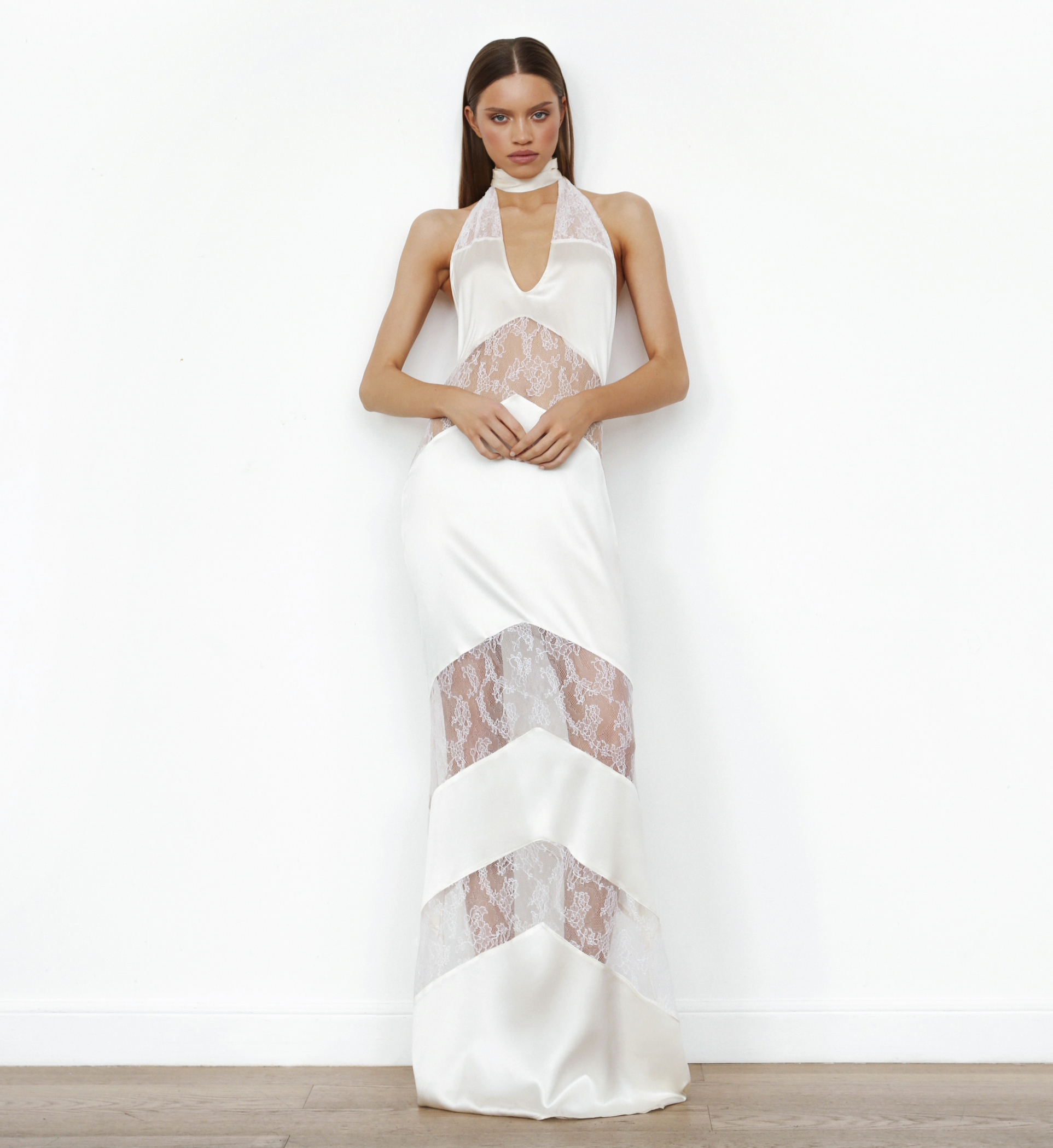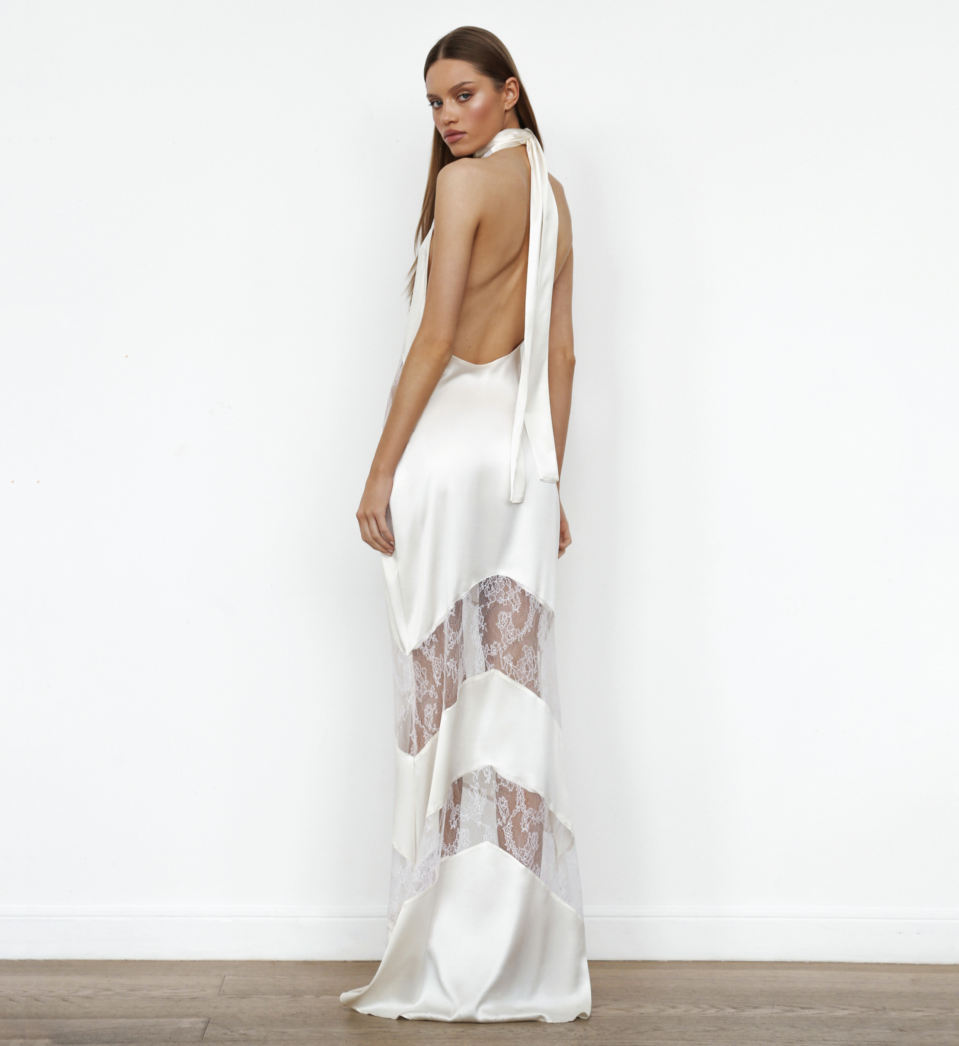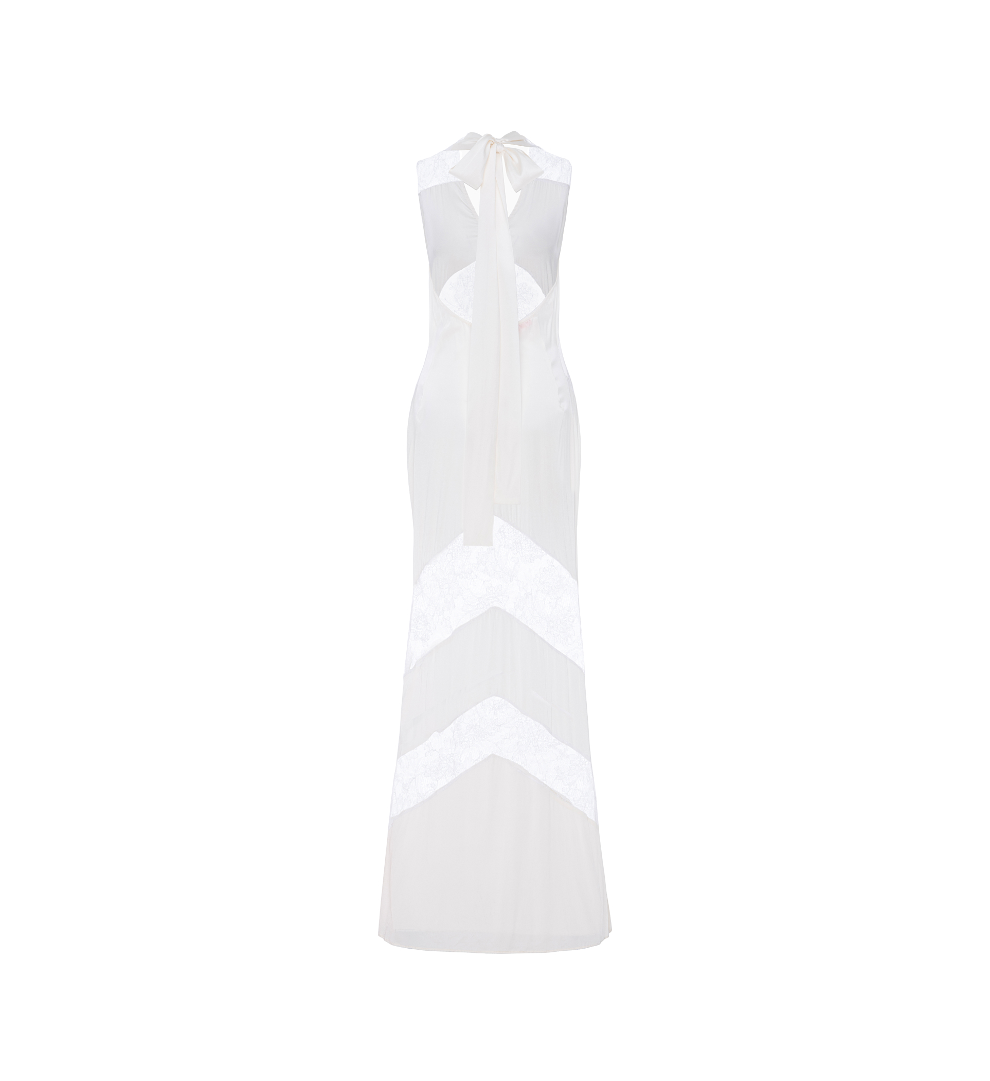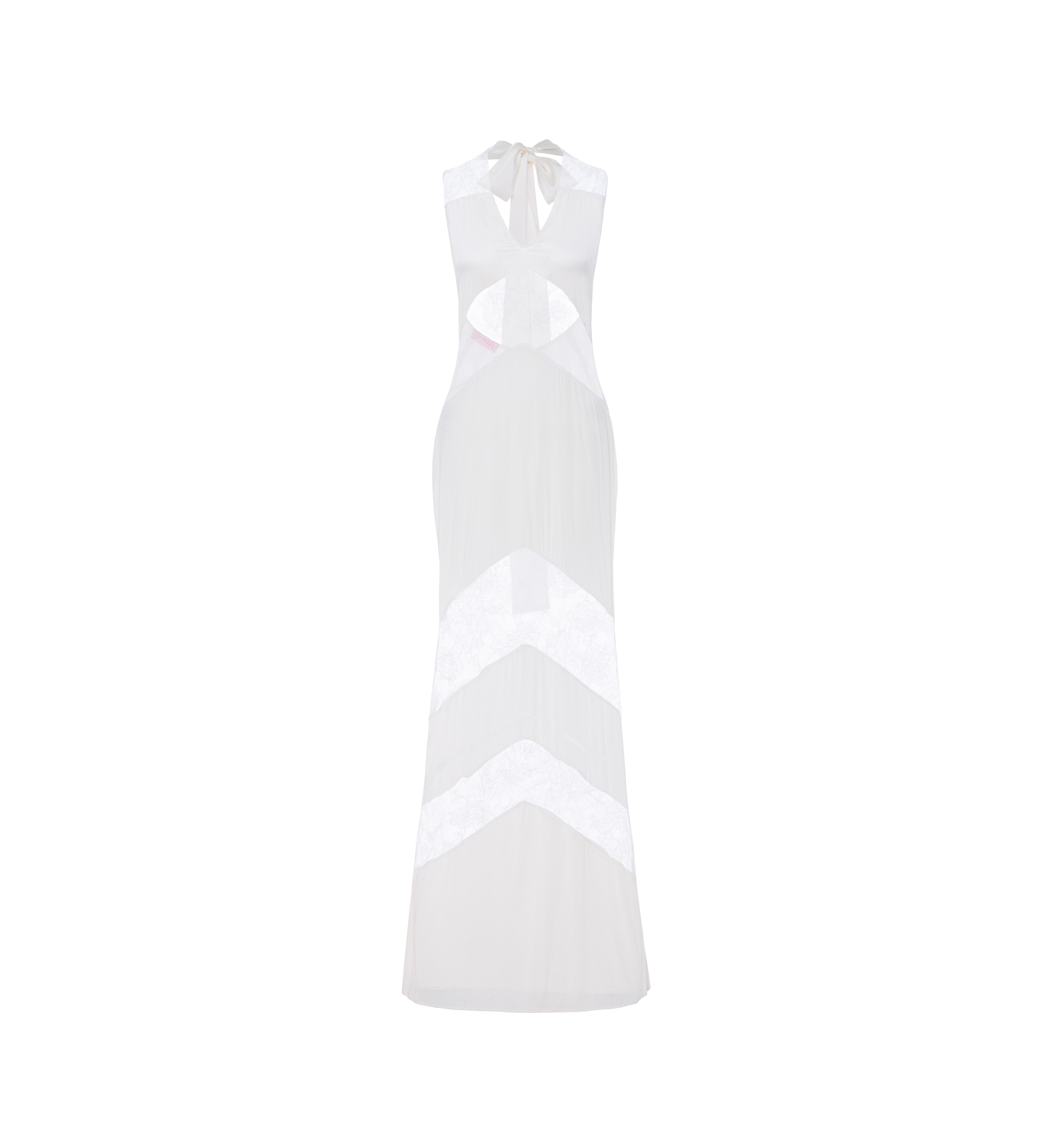 The maxi SOLSTISS dress made of natural silk in milky color for special occasions attracts attention and spectacularly flows at every step. Weightless fabric embroidered with elegant lace + accent oval cleavage form in motion a soft silhouette.