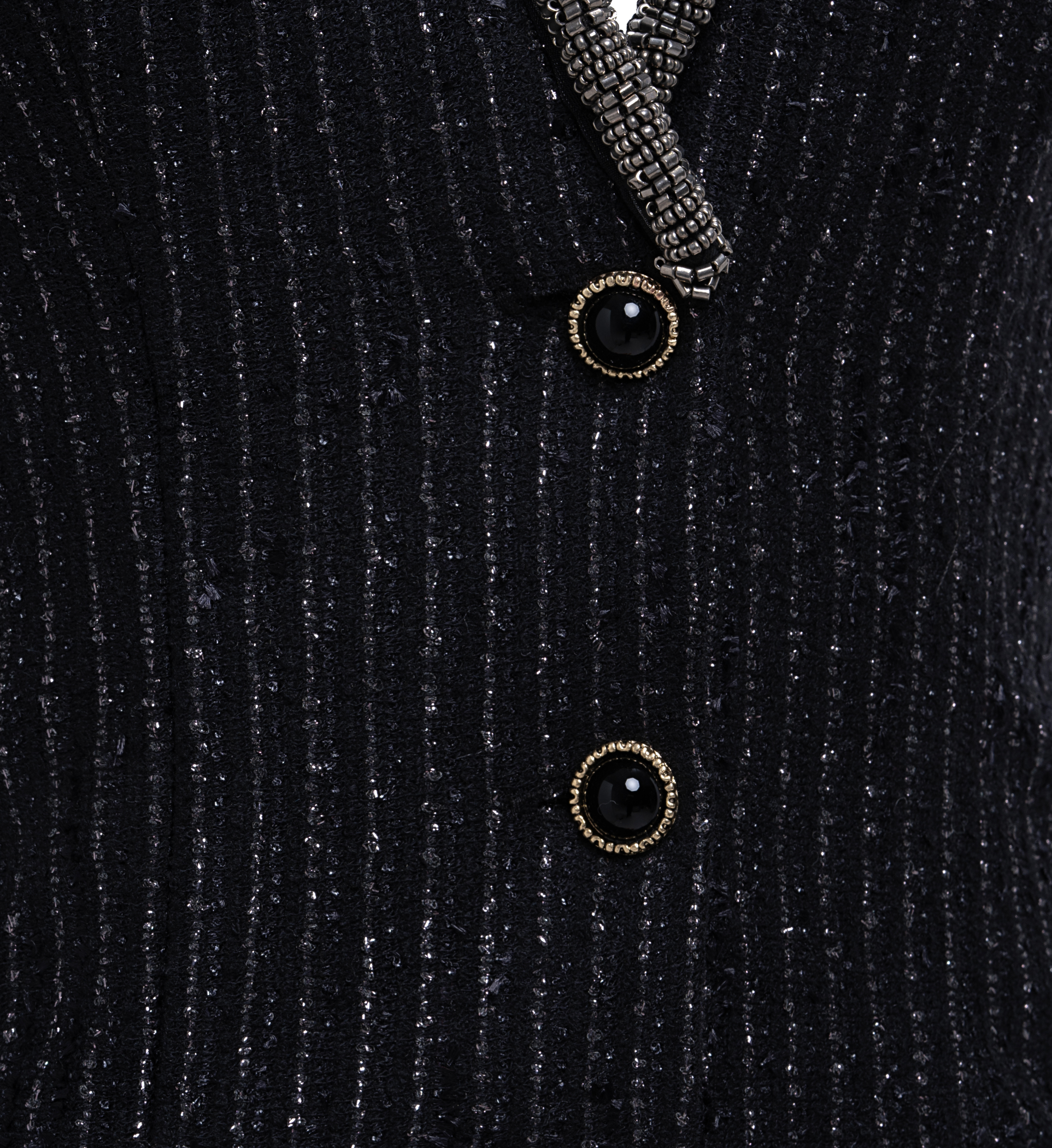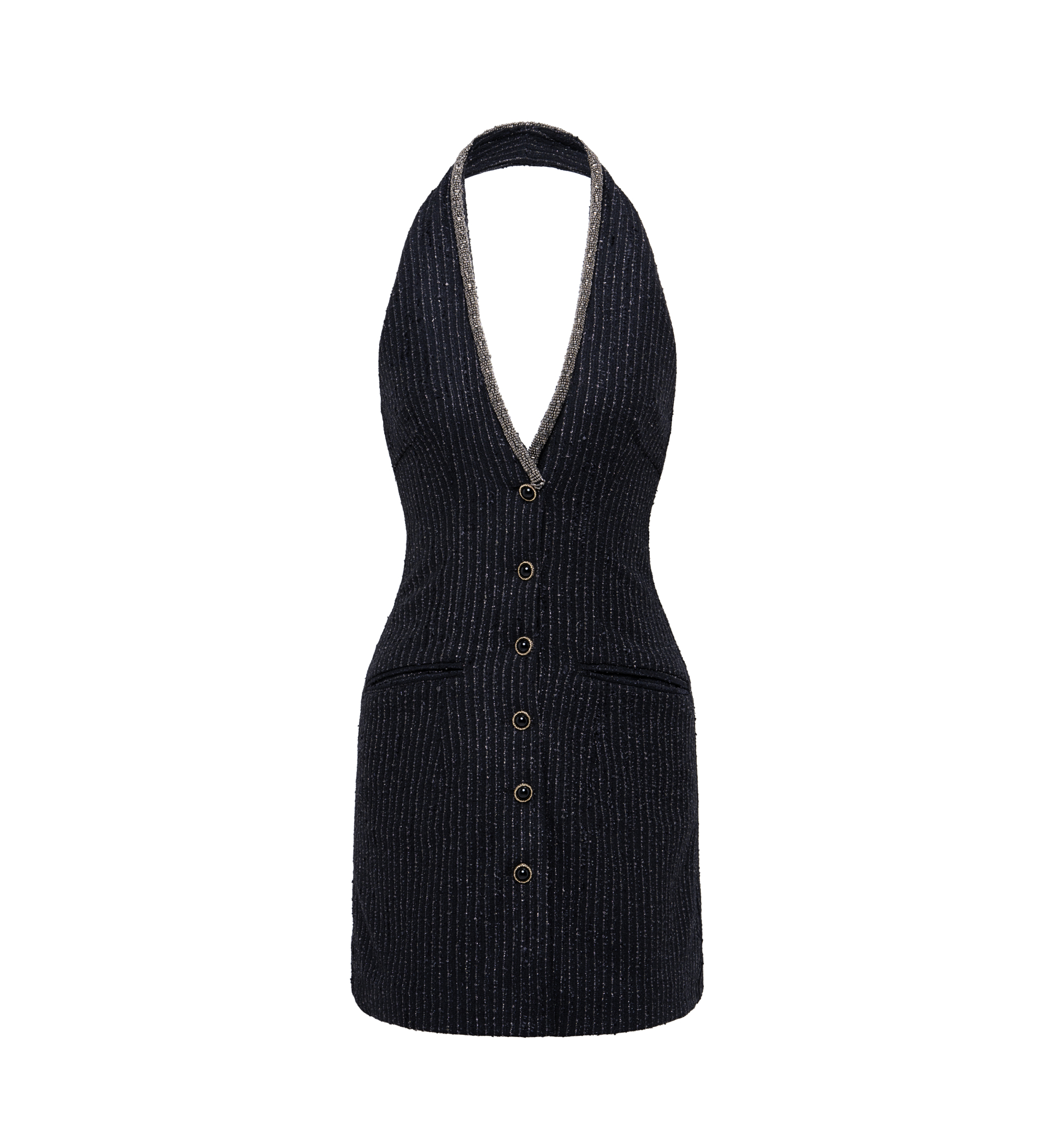 Striped tweed wool sundress is ideal for the autumn-winter season due to the warm and soft material. Tweed wool provides comfort when wearing, and the addition of lurex gives the dress sophistication and shine. The product is complemented with accent buttons and decorative beaded embroidery.