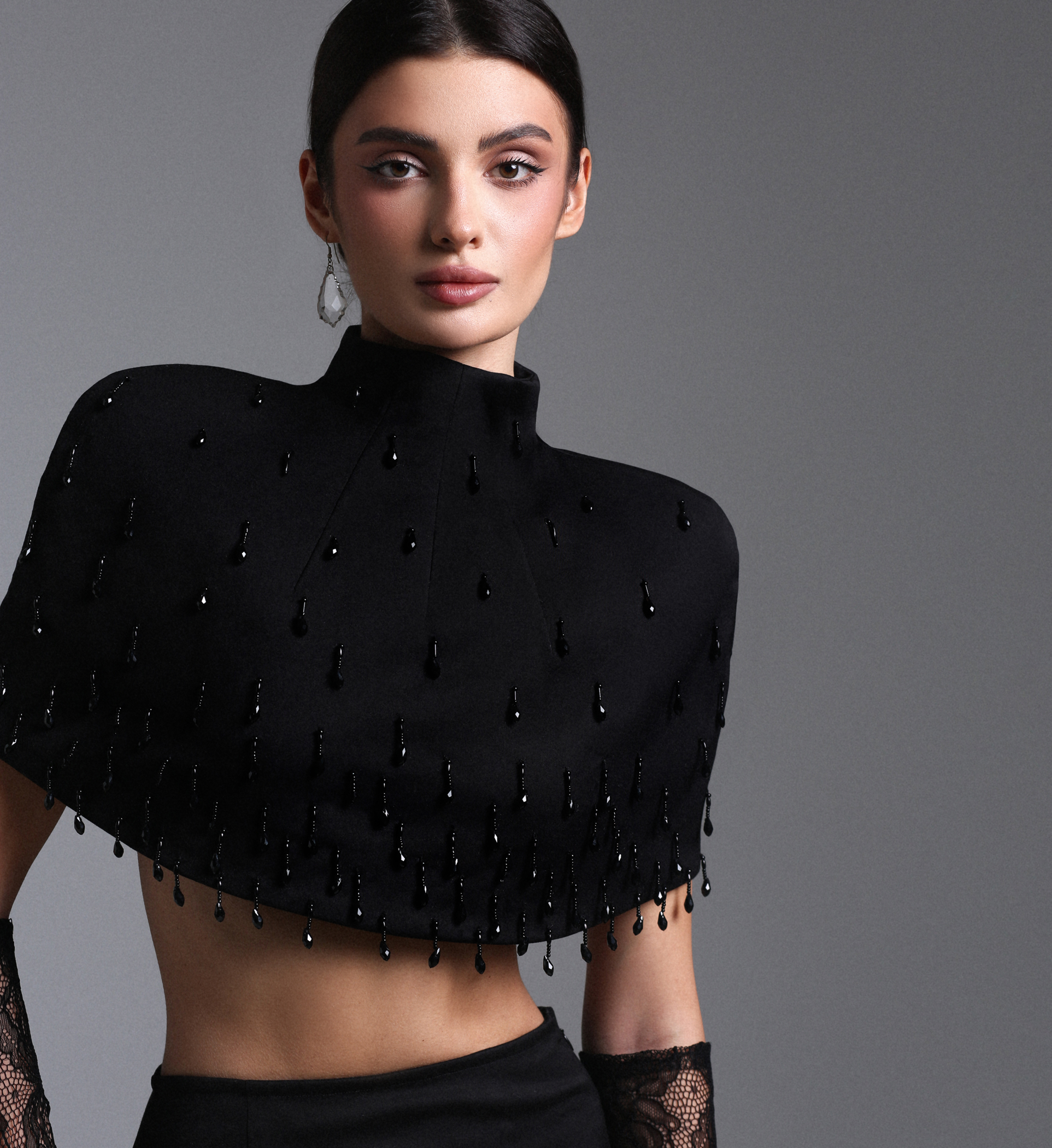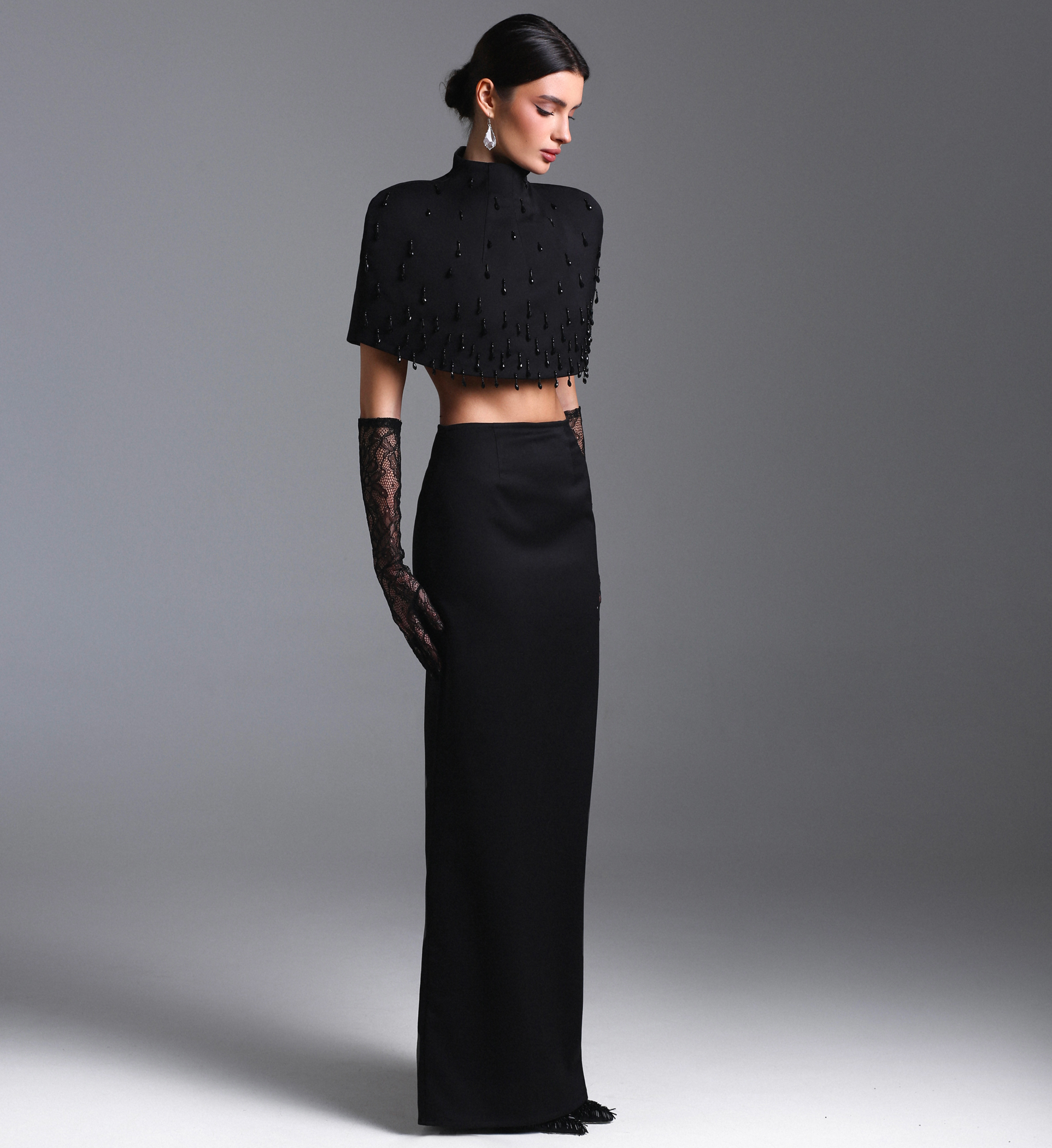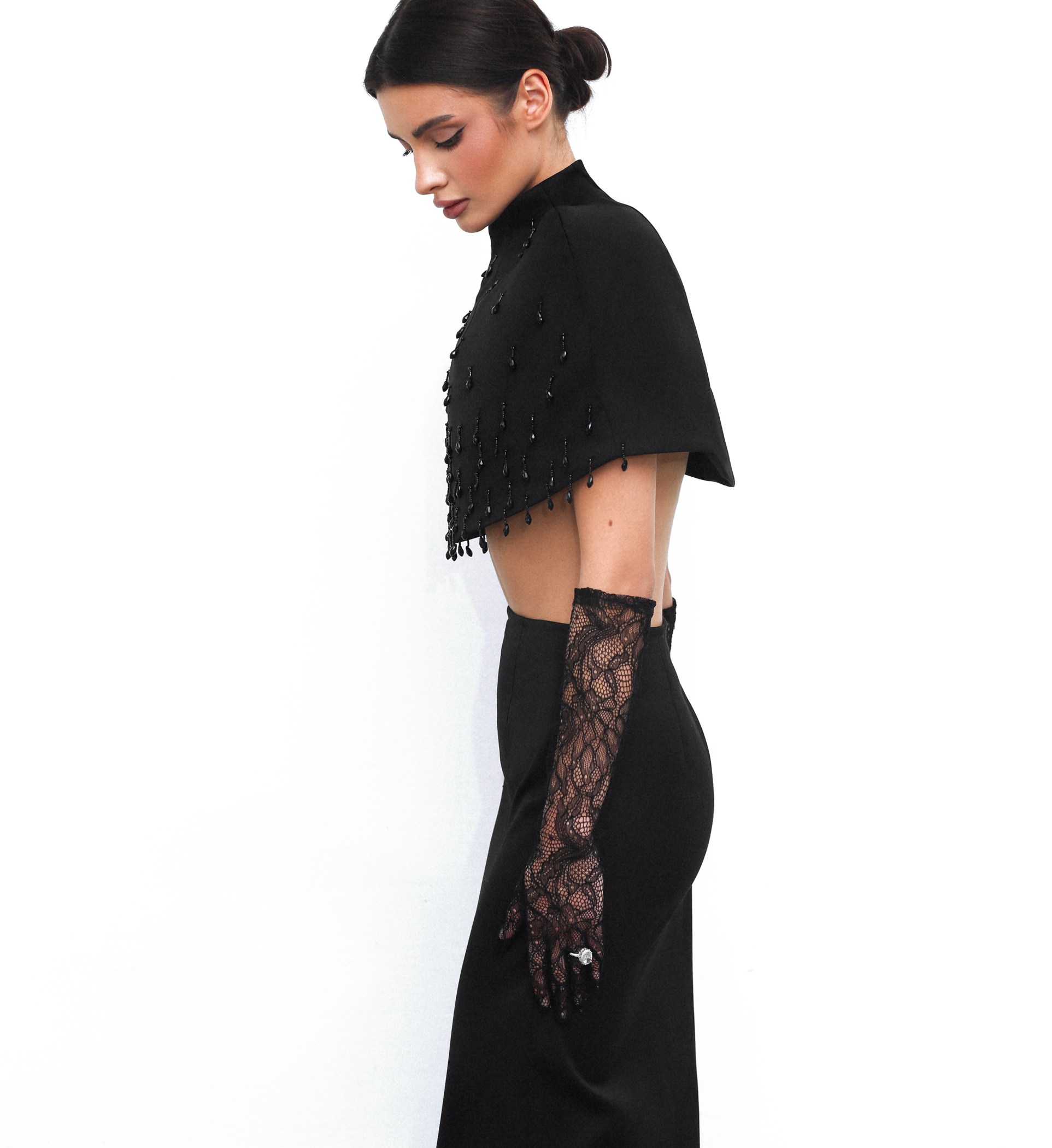 Cape in black suit fabric with hand-embroidered crystal beads and glass.