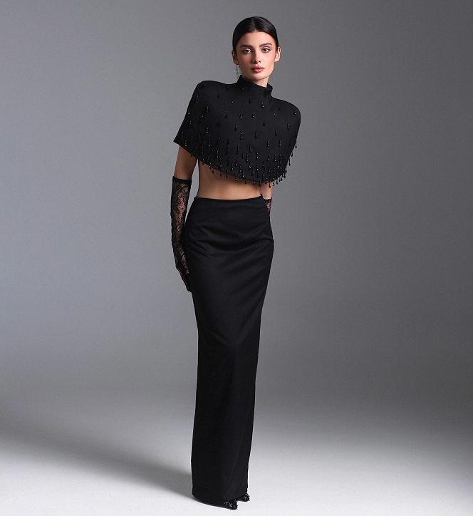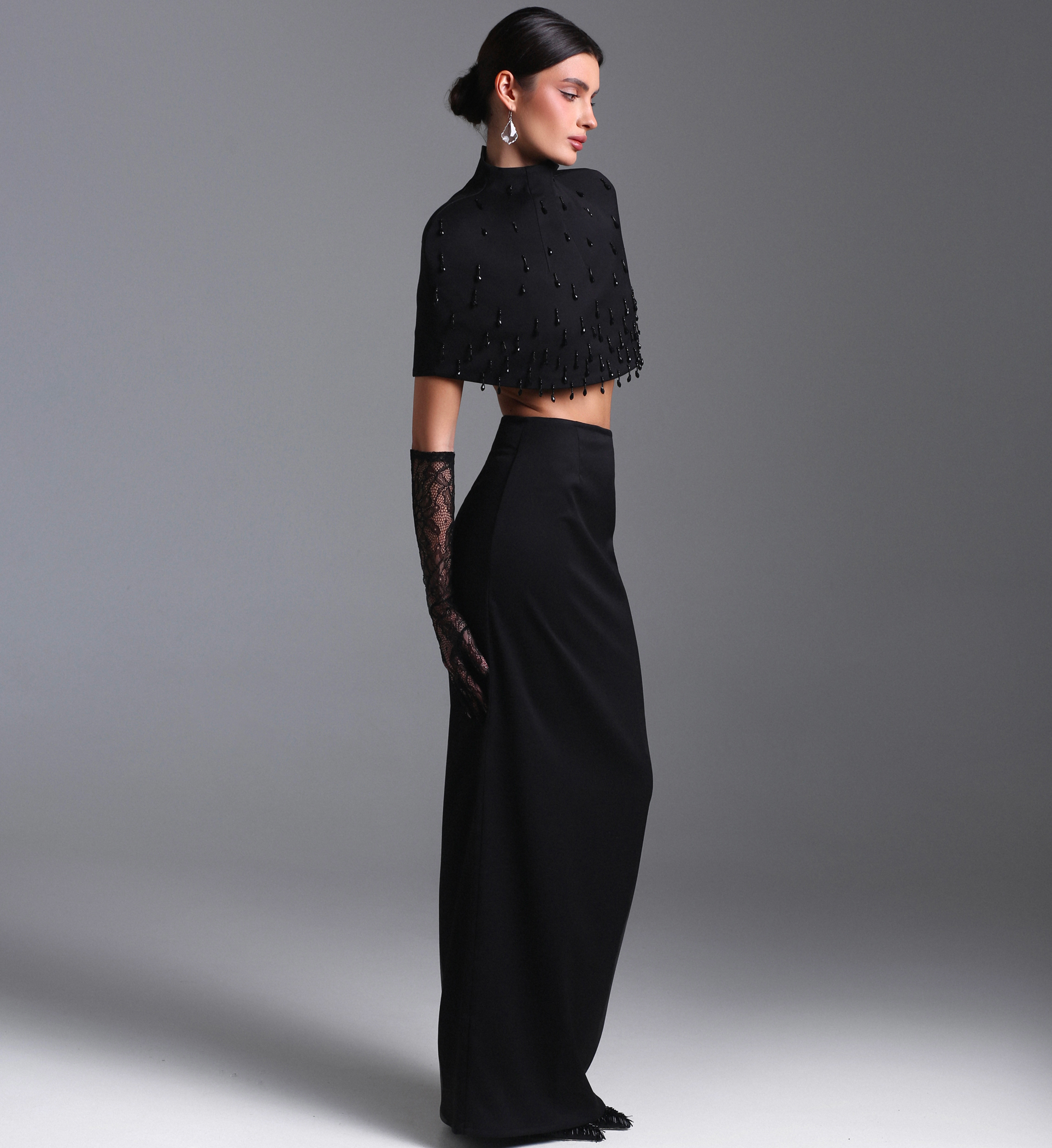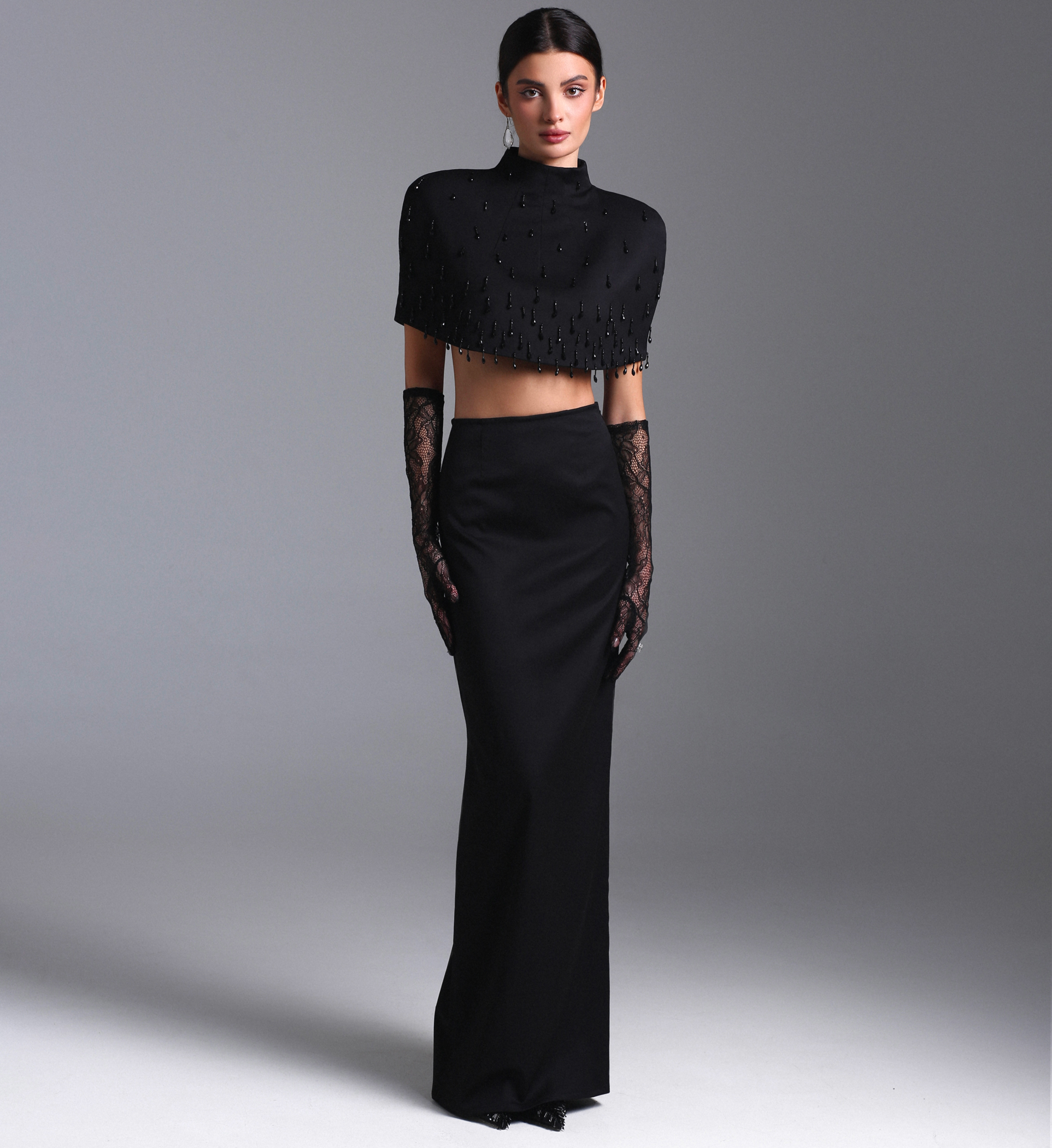 Cape in black suit fabric with hand-embroidered crystal beads and glass.