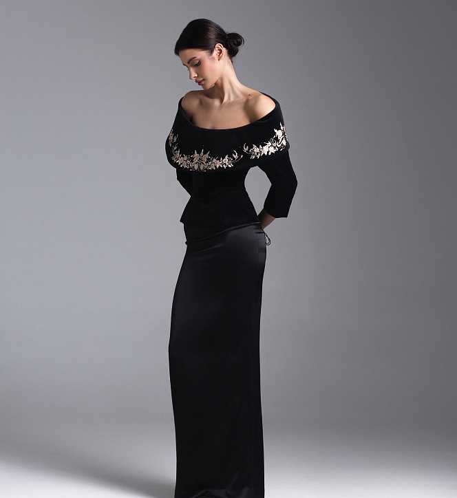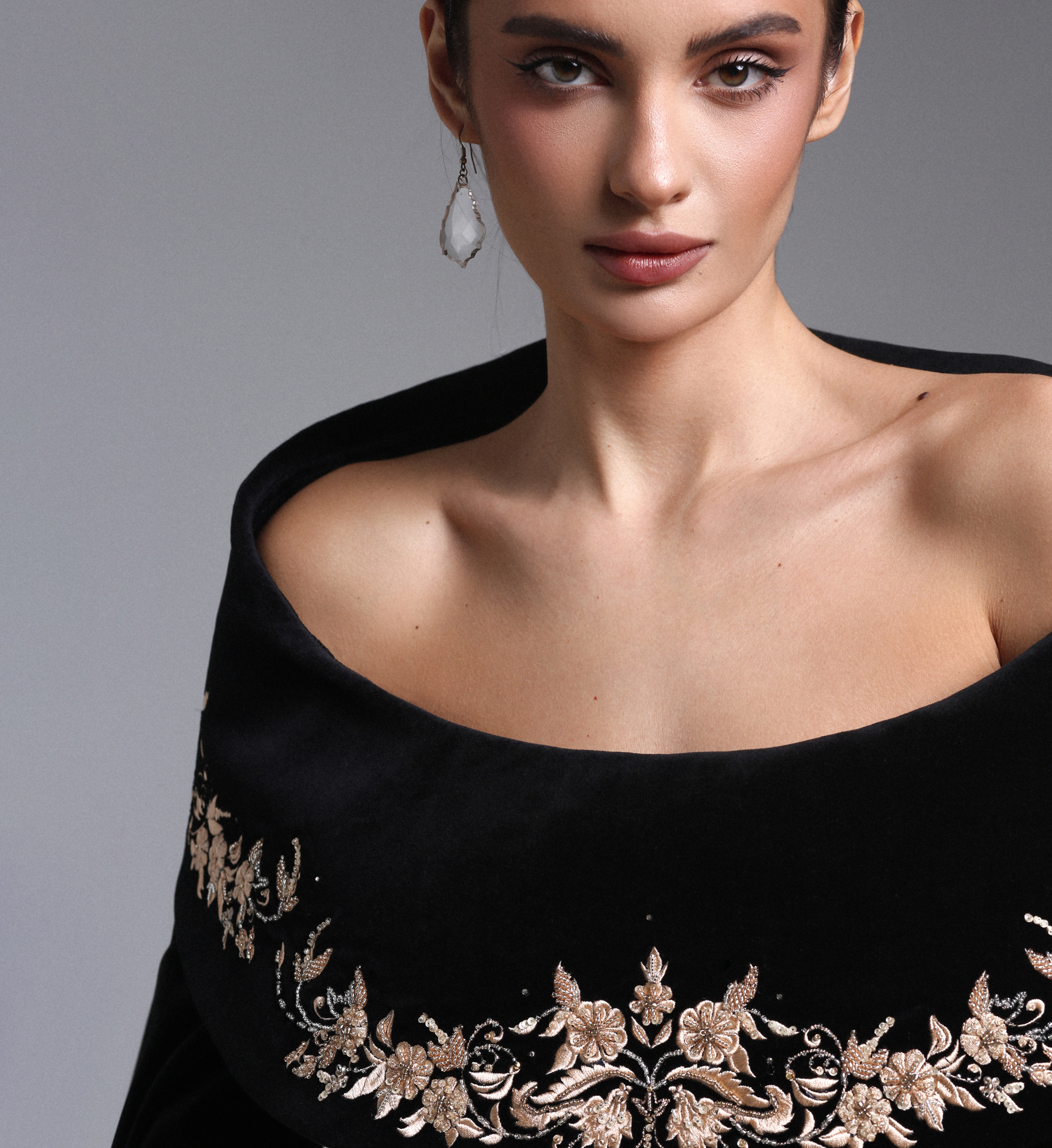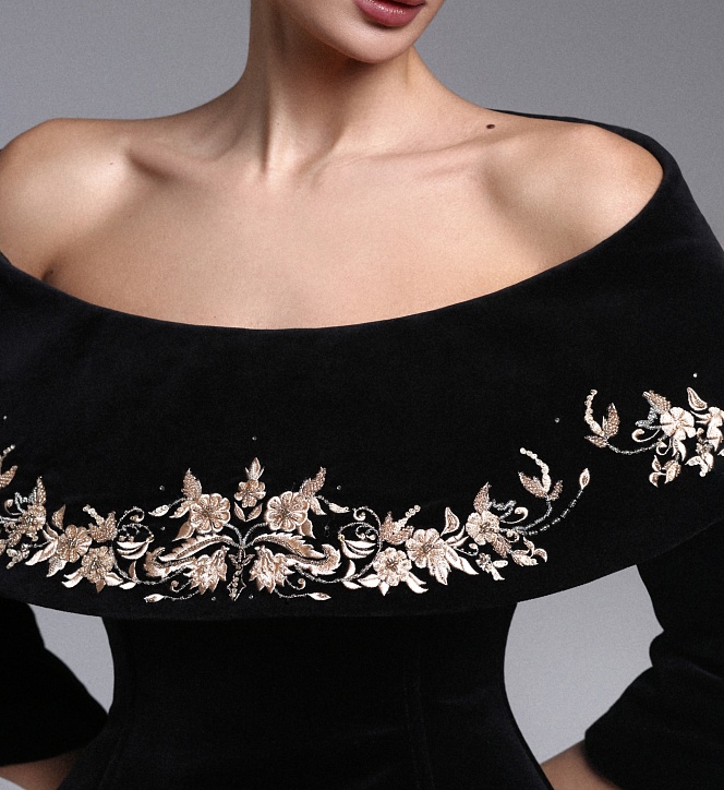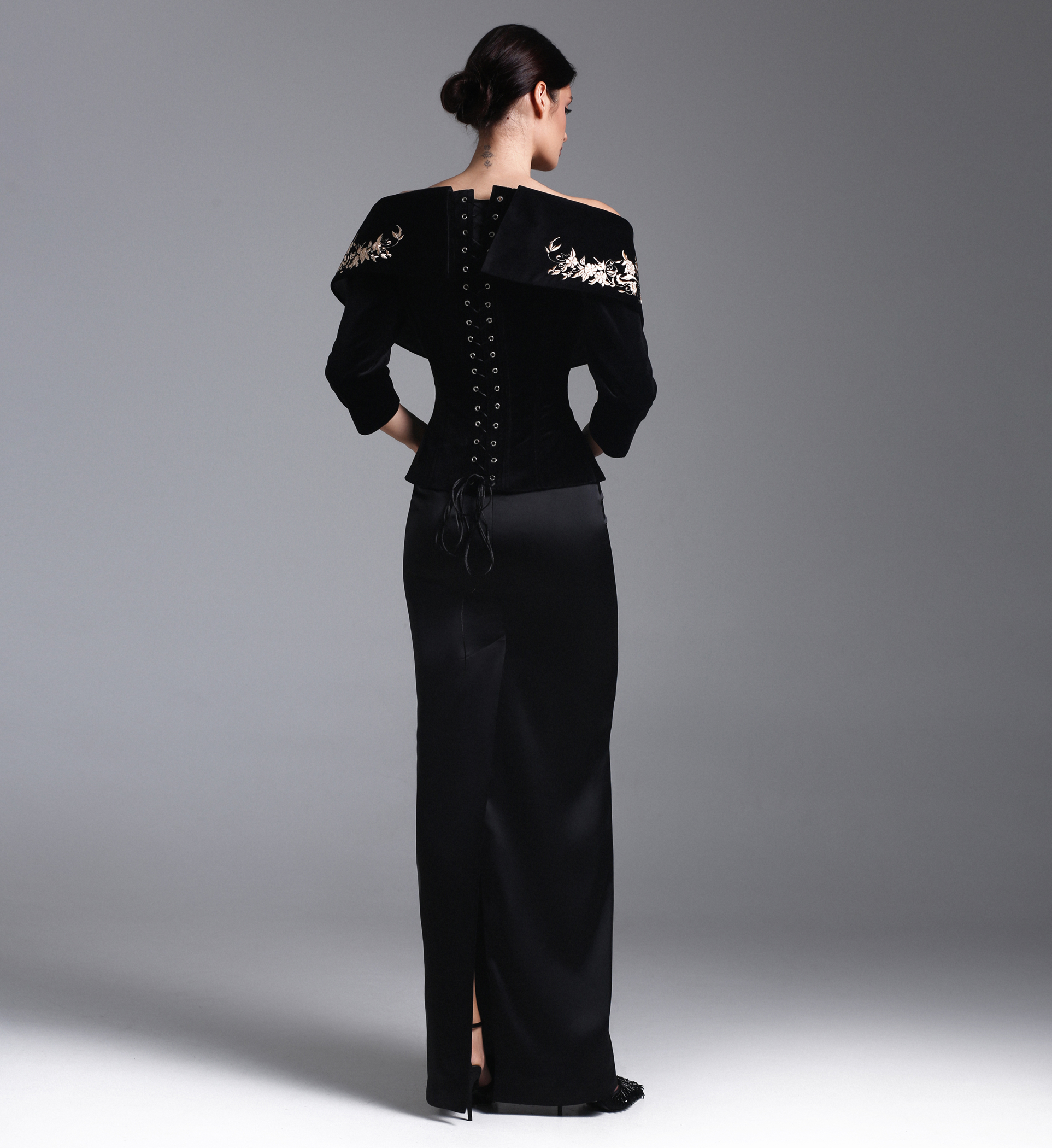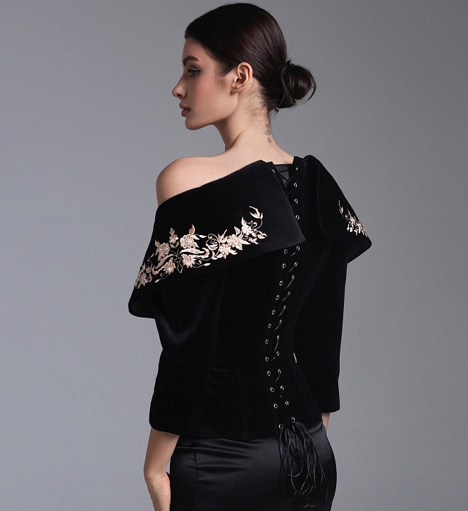 A black corset jacket with open shoulders made of velvet with hand-embroidered glass beads and silk threads.
