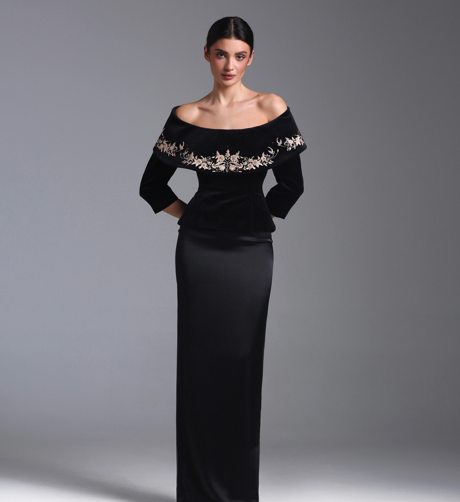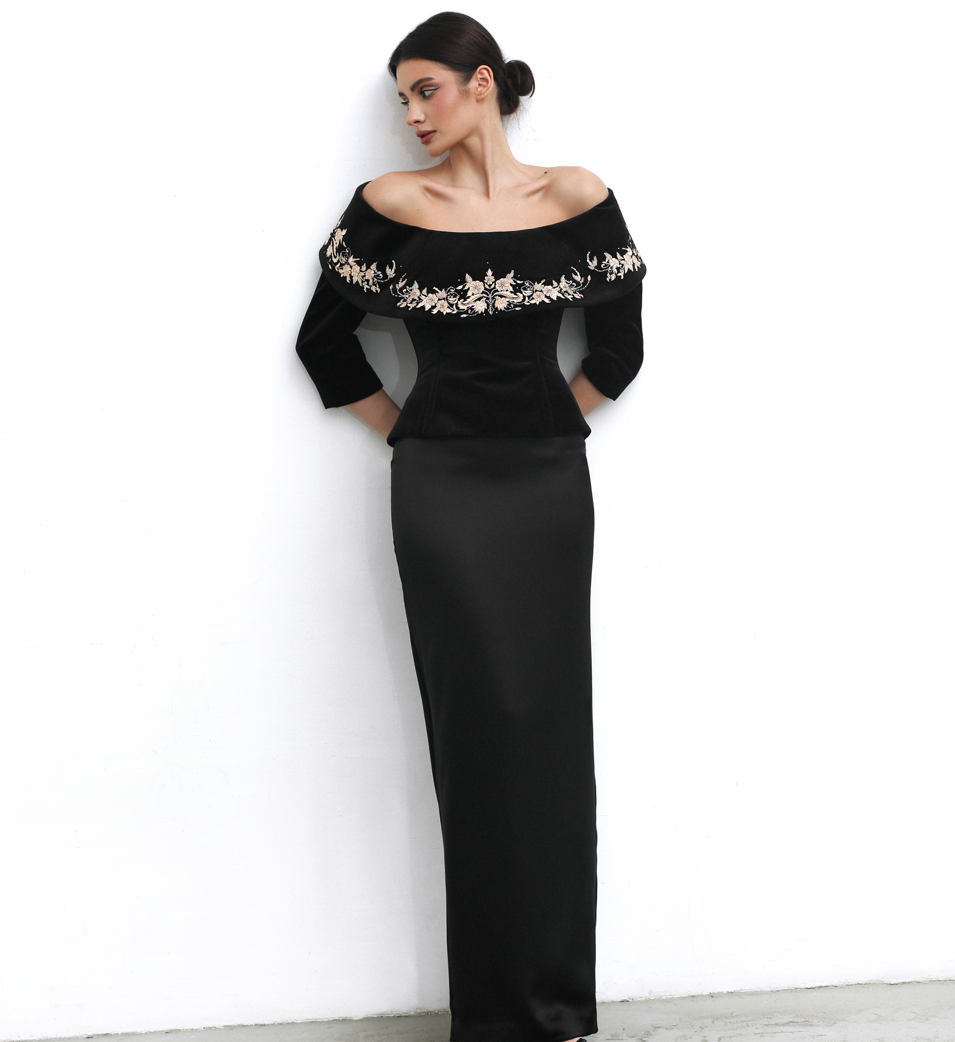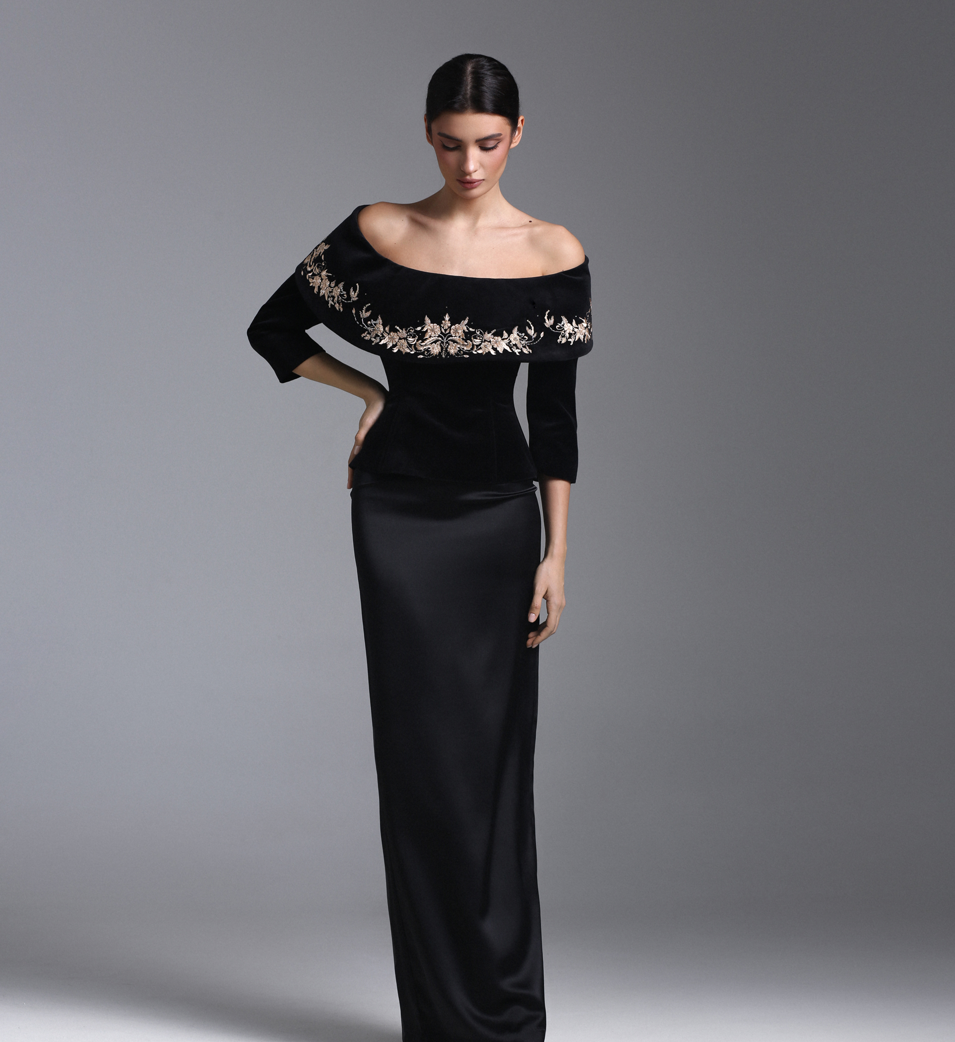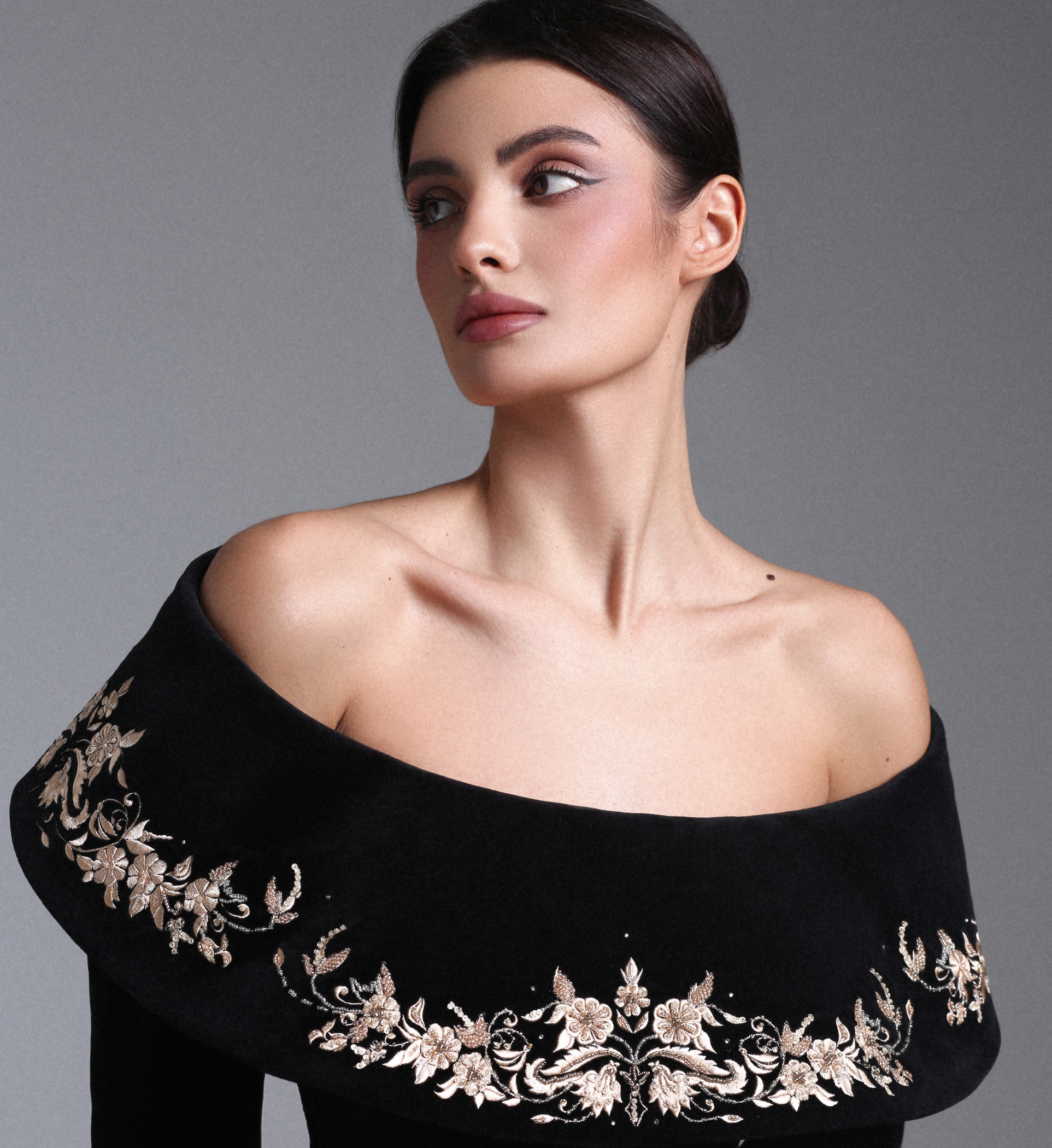 A black corset jacket with open shoulders made of velvet with hand-embroidered glass beads and silk threads.