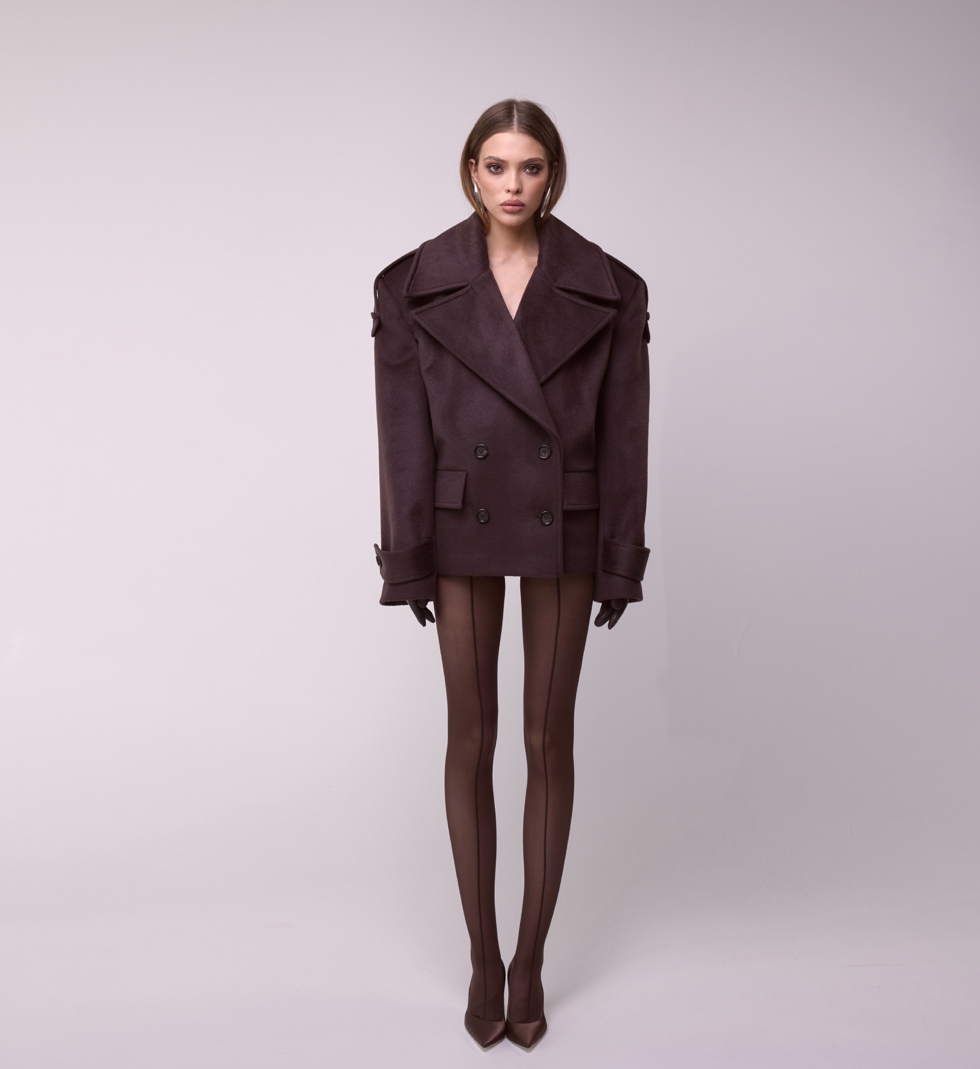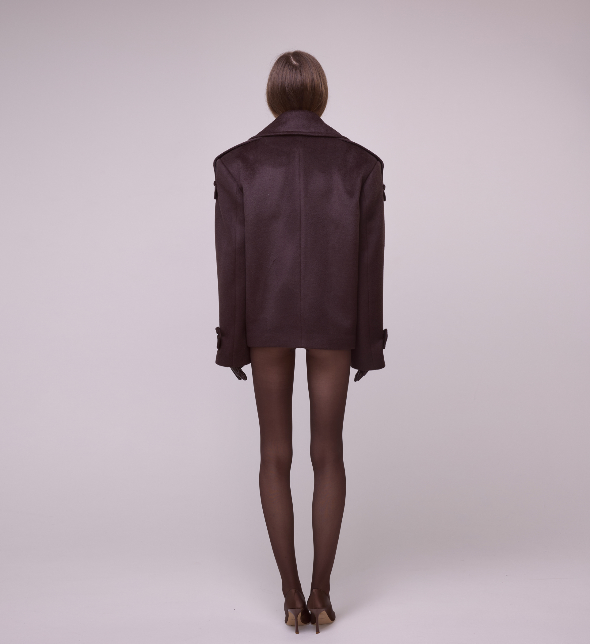 The cropped coat NUDE BROWN made of natural wool in a chocolate tone with expanded shoulders