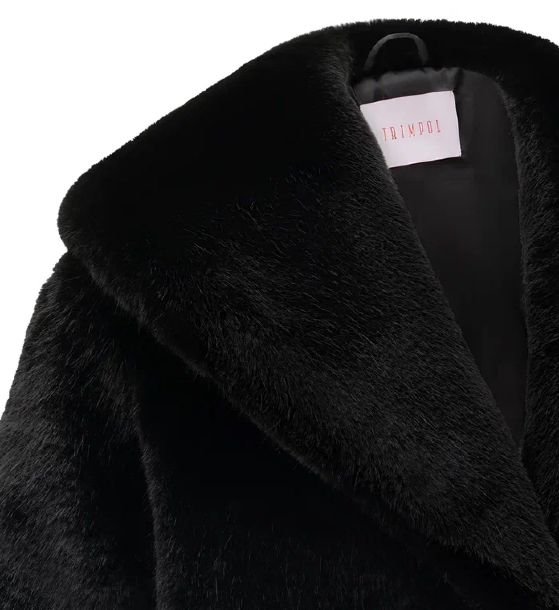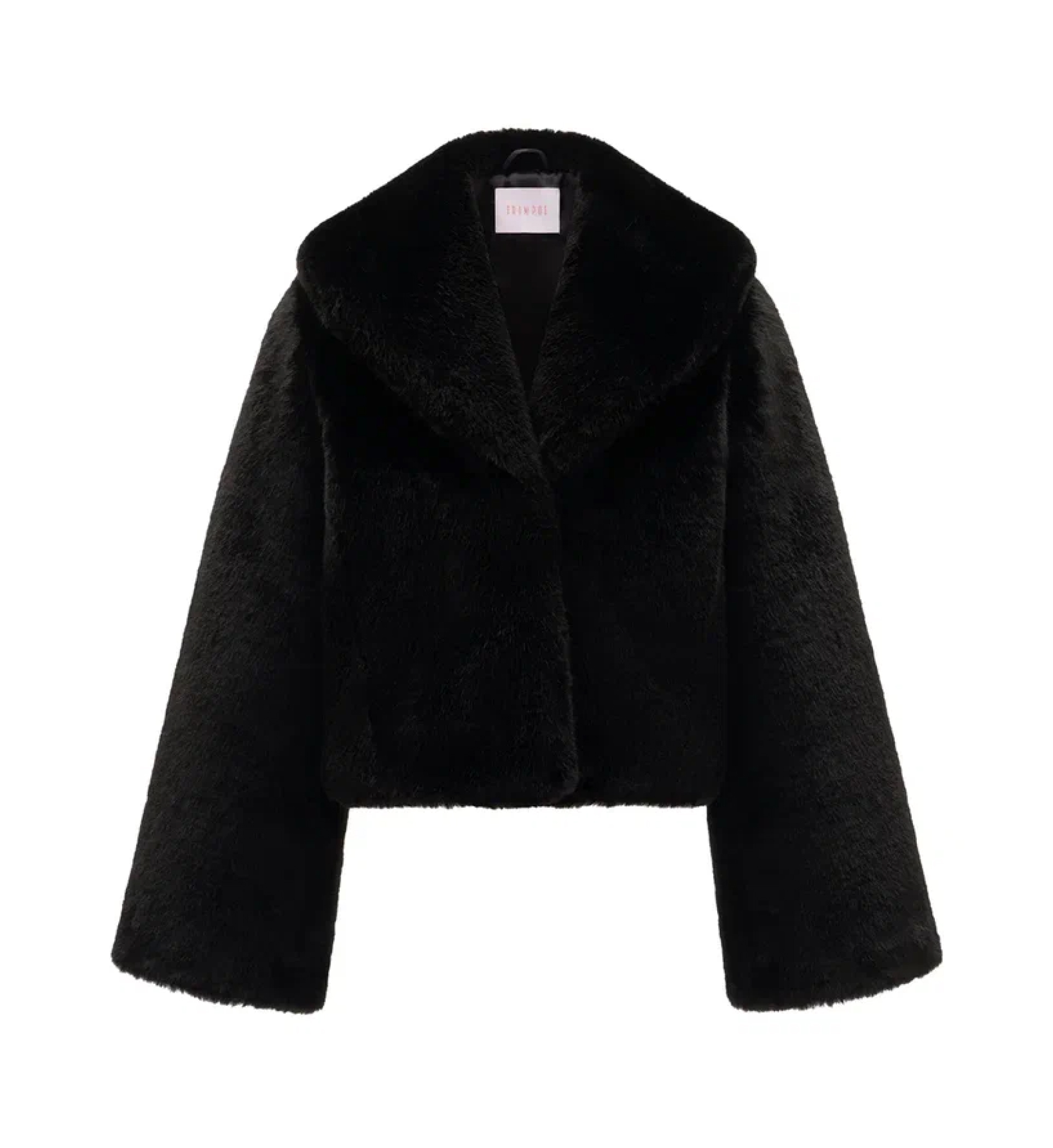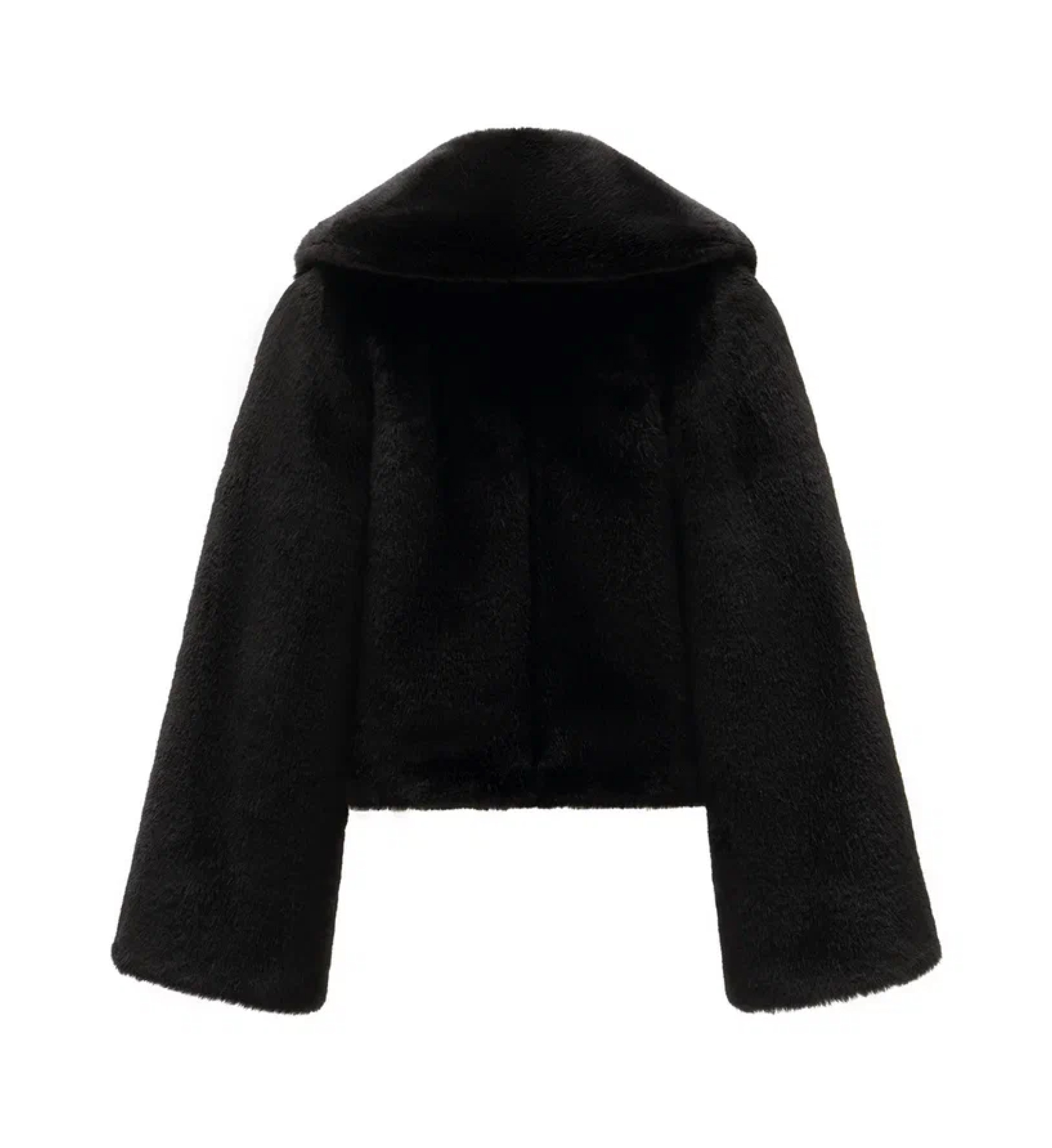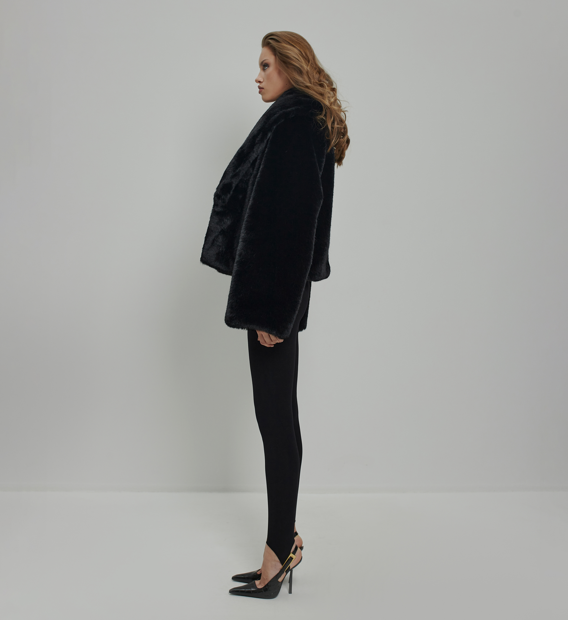 A cropped black fur coat made of faux fur with a shawl collar and buttonholes.