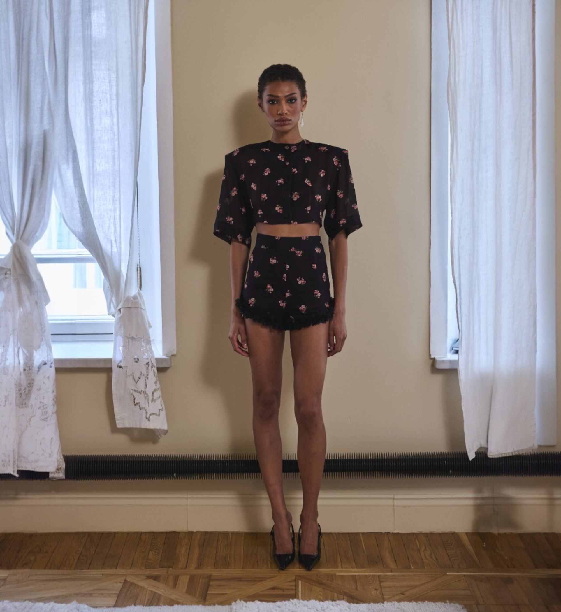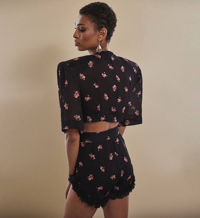 The high-waisted floral printed mini-shorts with fishnet trim made of viscose chiffon.