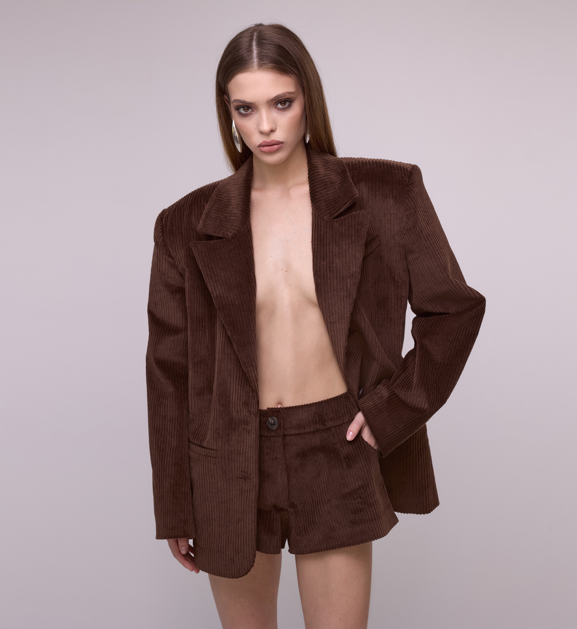 Corduroy WOOD mini shorts with a low waist in chocolate color