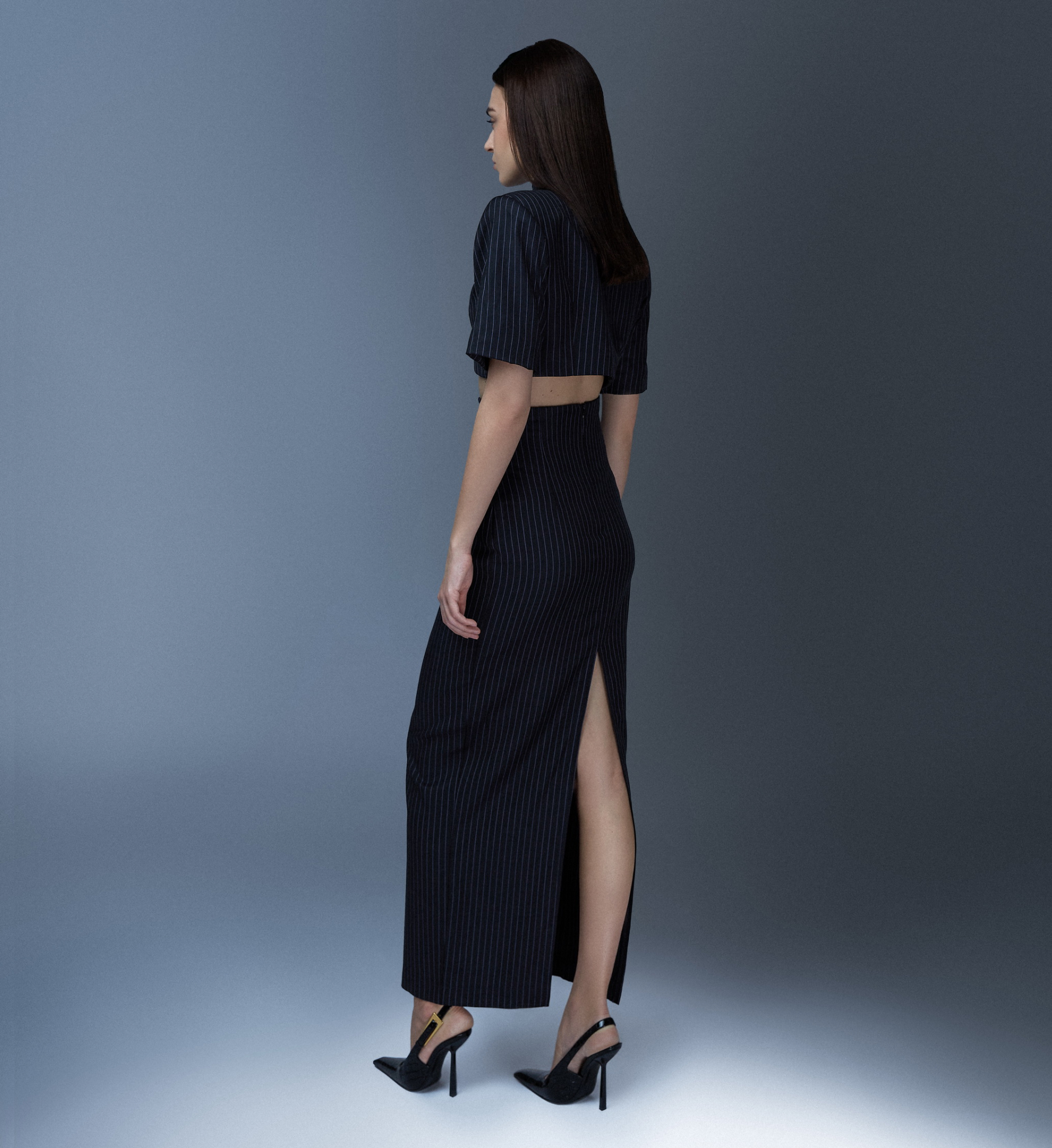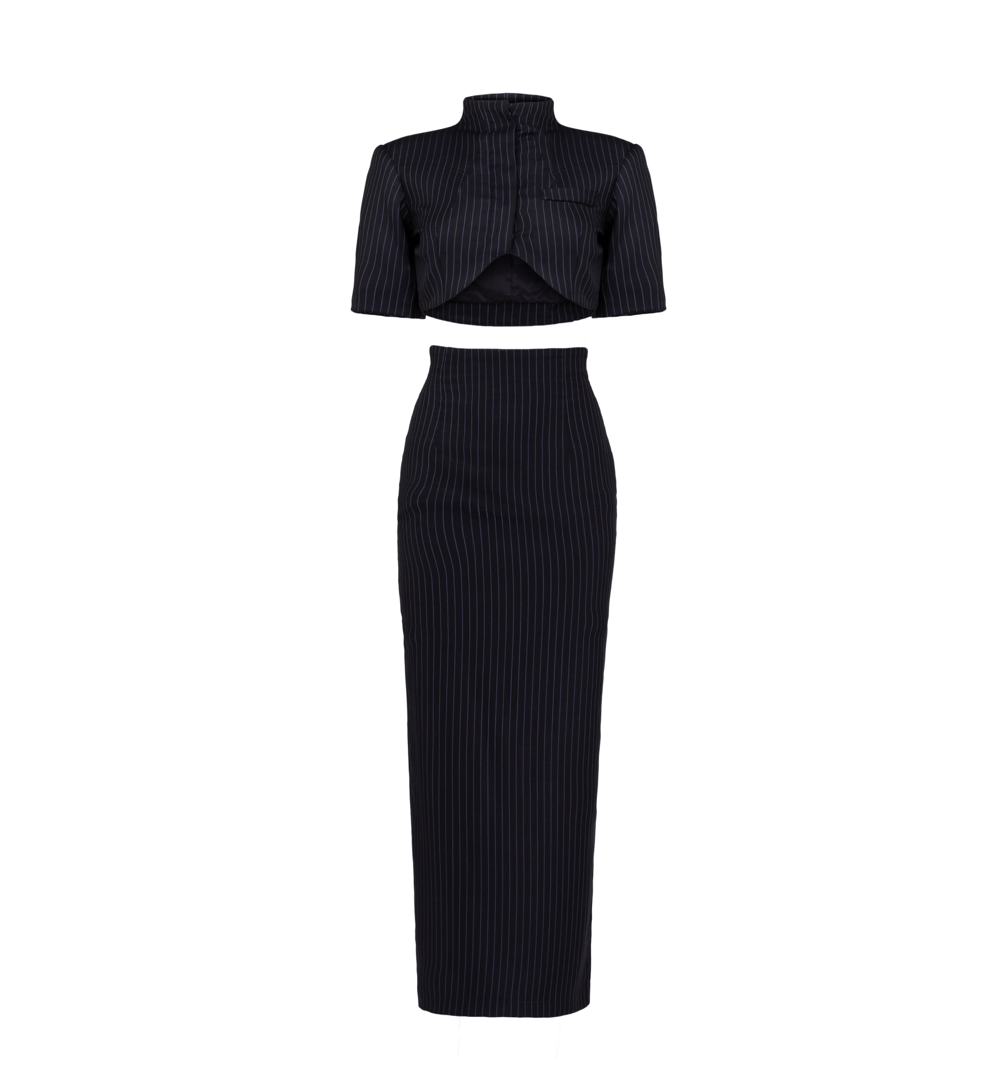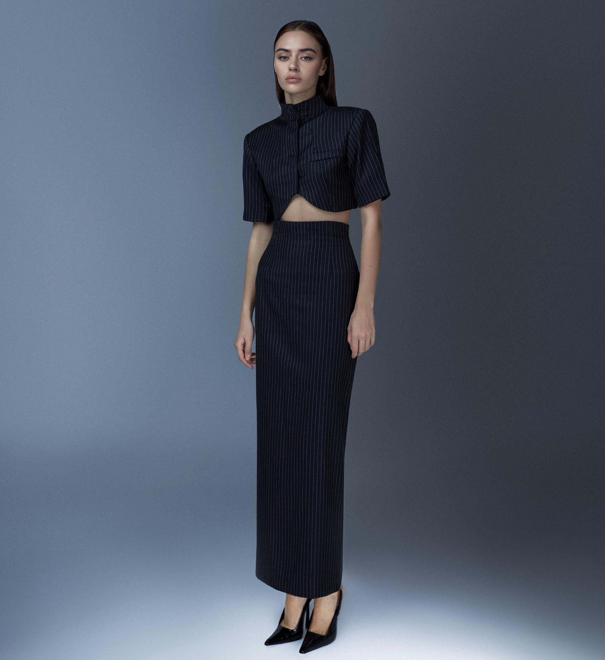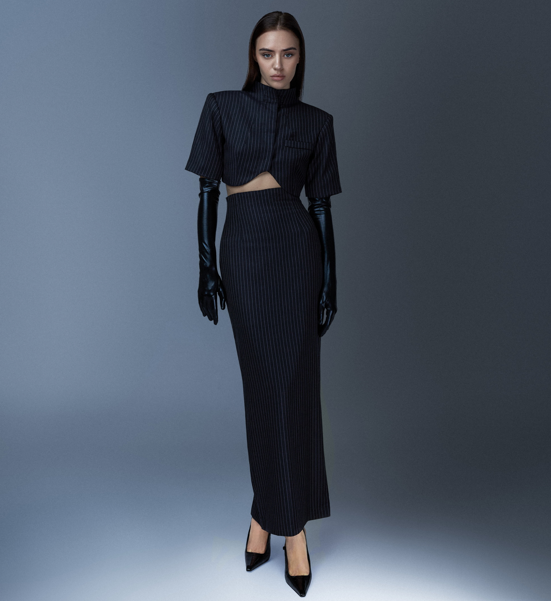 Length is an essential factor that sets the mood for the whole image. The DNA of our brand is an elongated maxi, which turns the image of a girl into a strict but captivating, mysterious but sexy one. The high waist, striped fabric - all this creates an elongated and slender silhouette. The skirt goes perfectly with our cropped jacket made of the same material, turning your outfit into an exclusive look for going out. The skirt can be conveniently combined with classic tops, silk T-shirts, cotton shirts and even thick T-shirts. A real musthave!